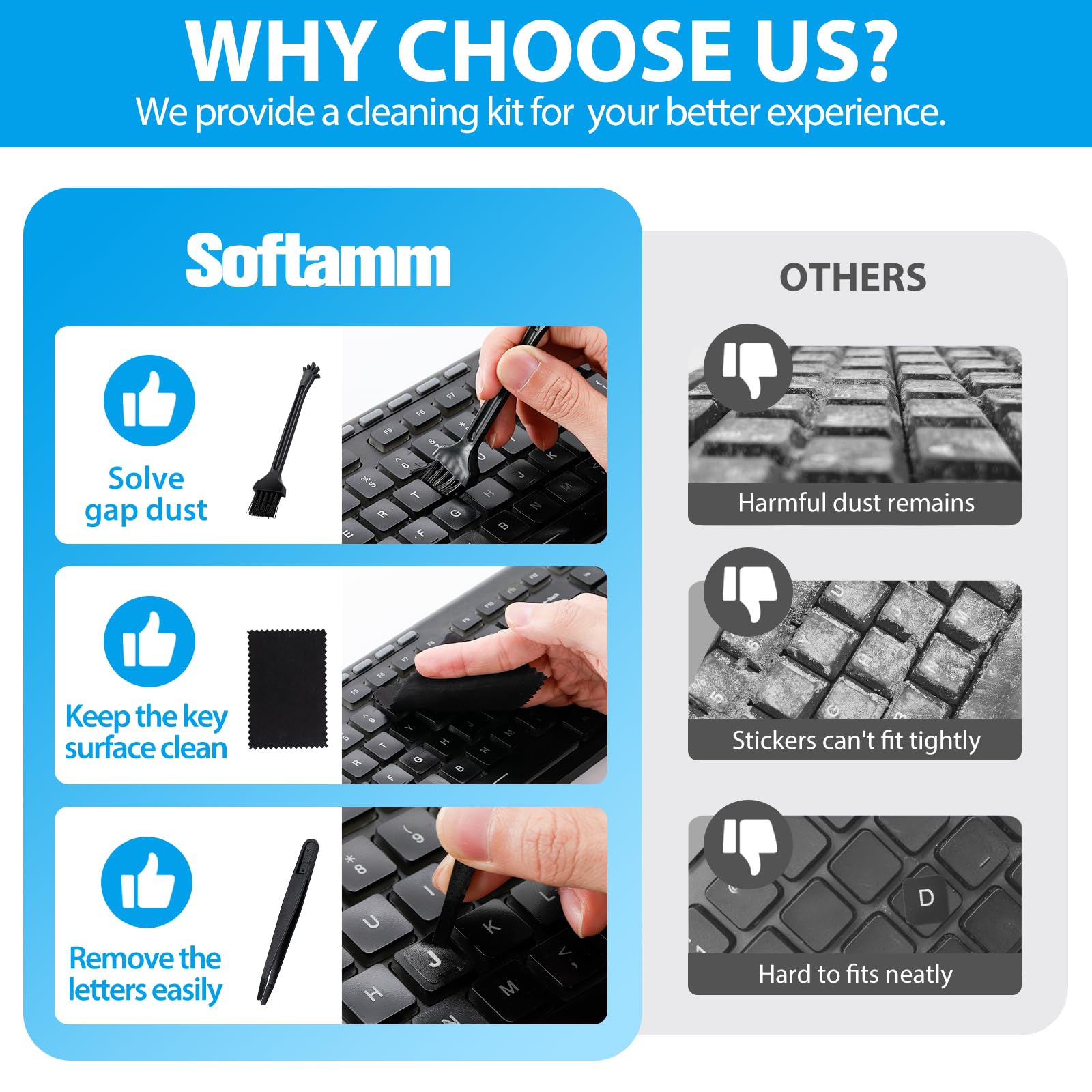 【Save Your Time & Quick installation 】 The tweezers can help you quickly remove the small alphabet stickers and align with the keyboard keys, while the cleaning brush and cleaning cloth can help you quickly clean the keyboard surface from dust, water, and other debris..