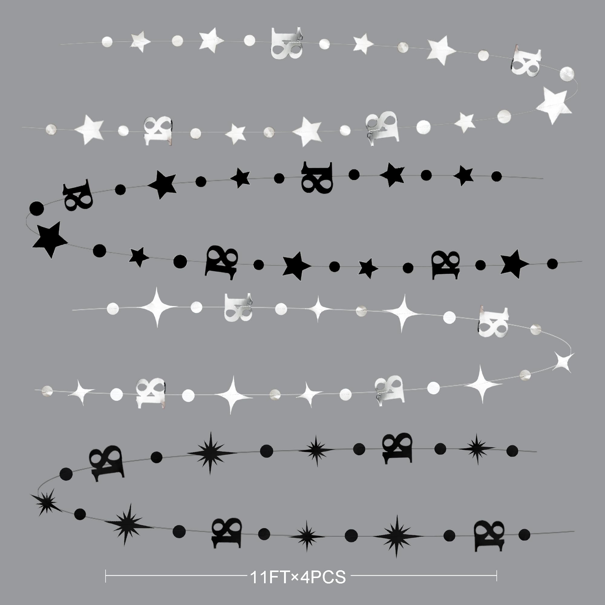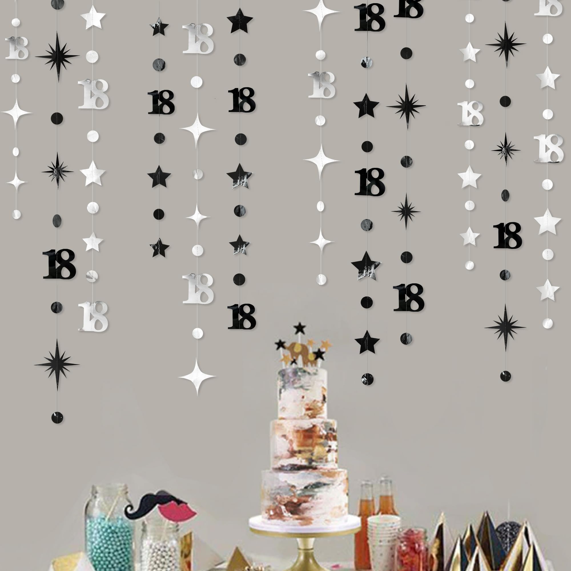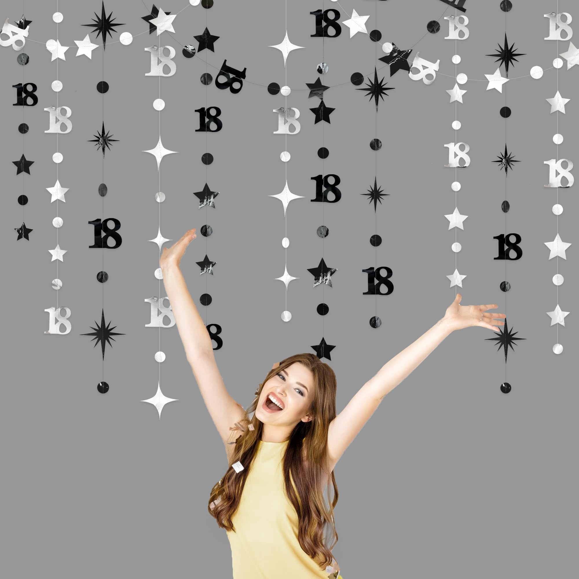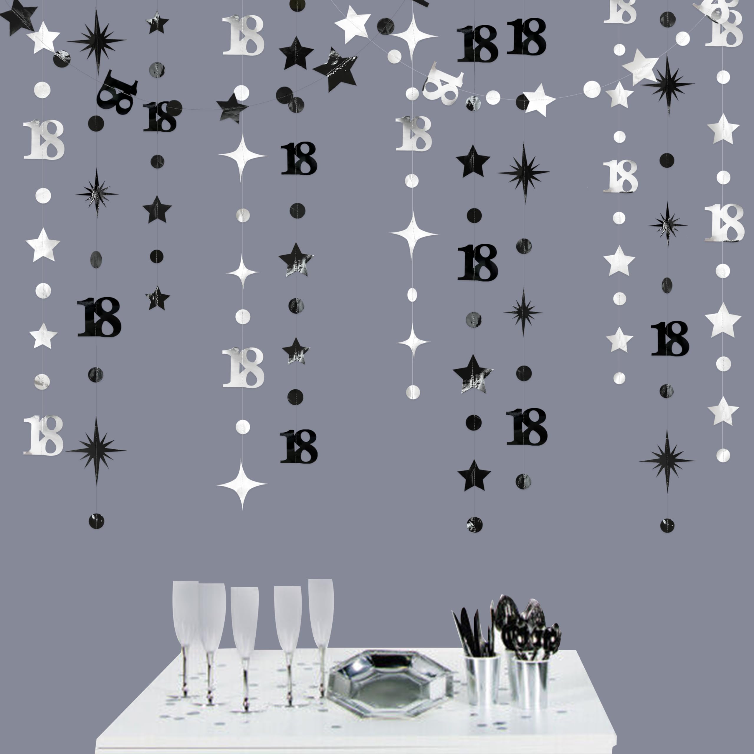 👍 Package includes - 4 strings of 11.5 feet/3.5 meters silver black number 18 sparkling twinkle star and circle dots garlands , totally is 46 feet/14 meters