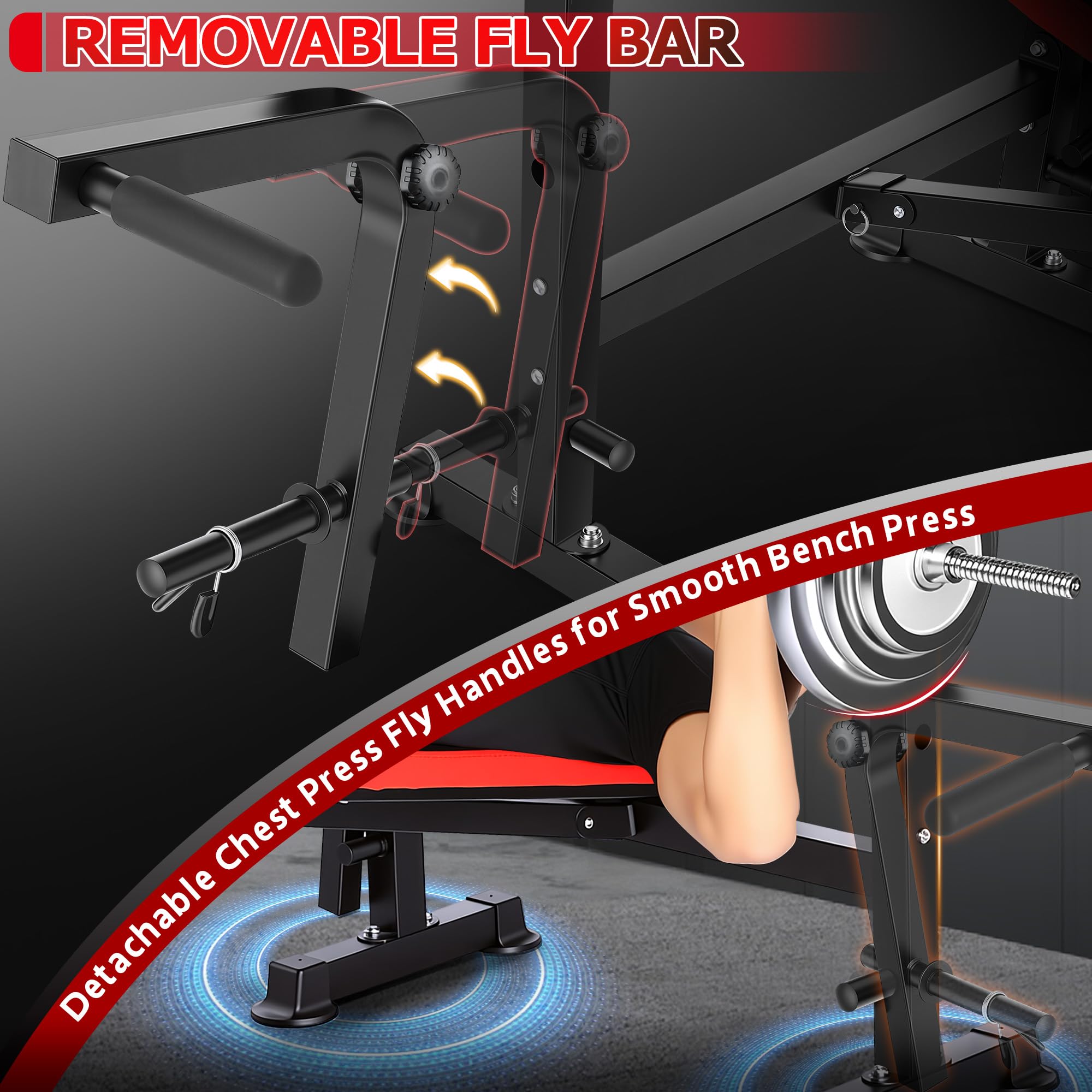 [Real All-in-One] Get your entire home gym in one compact bench. features weight bench, squat rack, and preacher curl pad, T-handle, leg developer, detachable chest fly attachments for multi types or training ropes, dip stand bar for classic style. Perfect starter setup for serious home training.