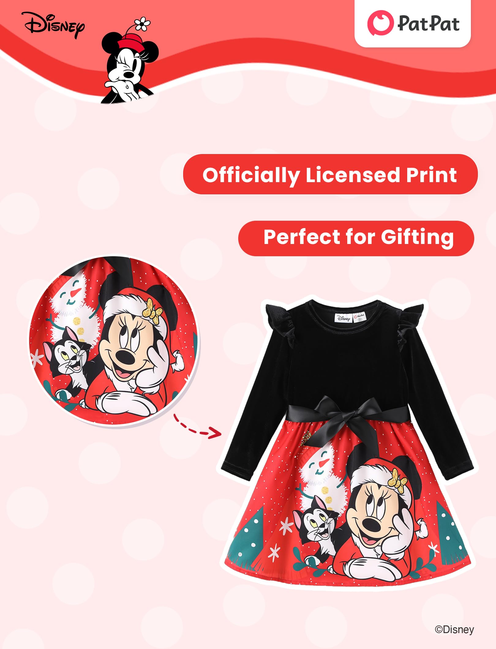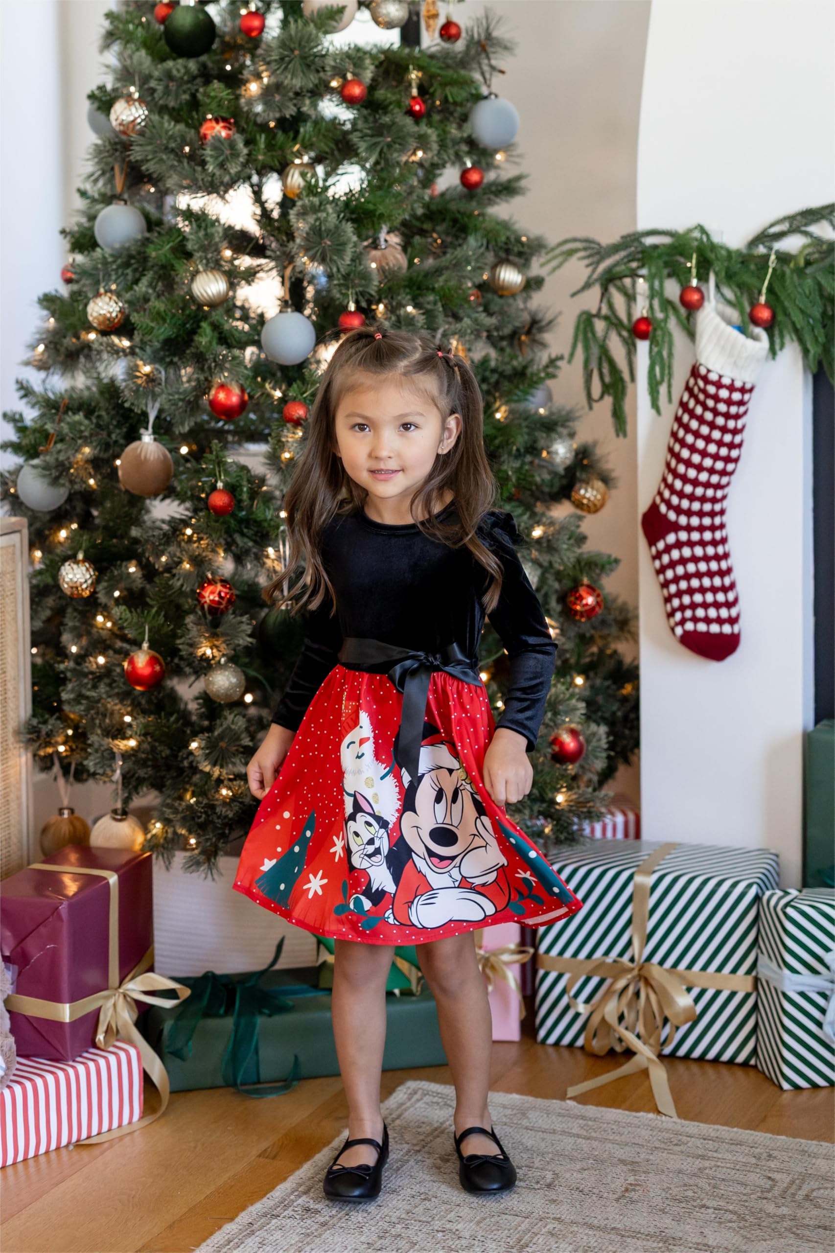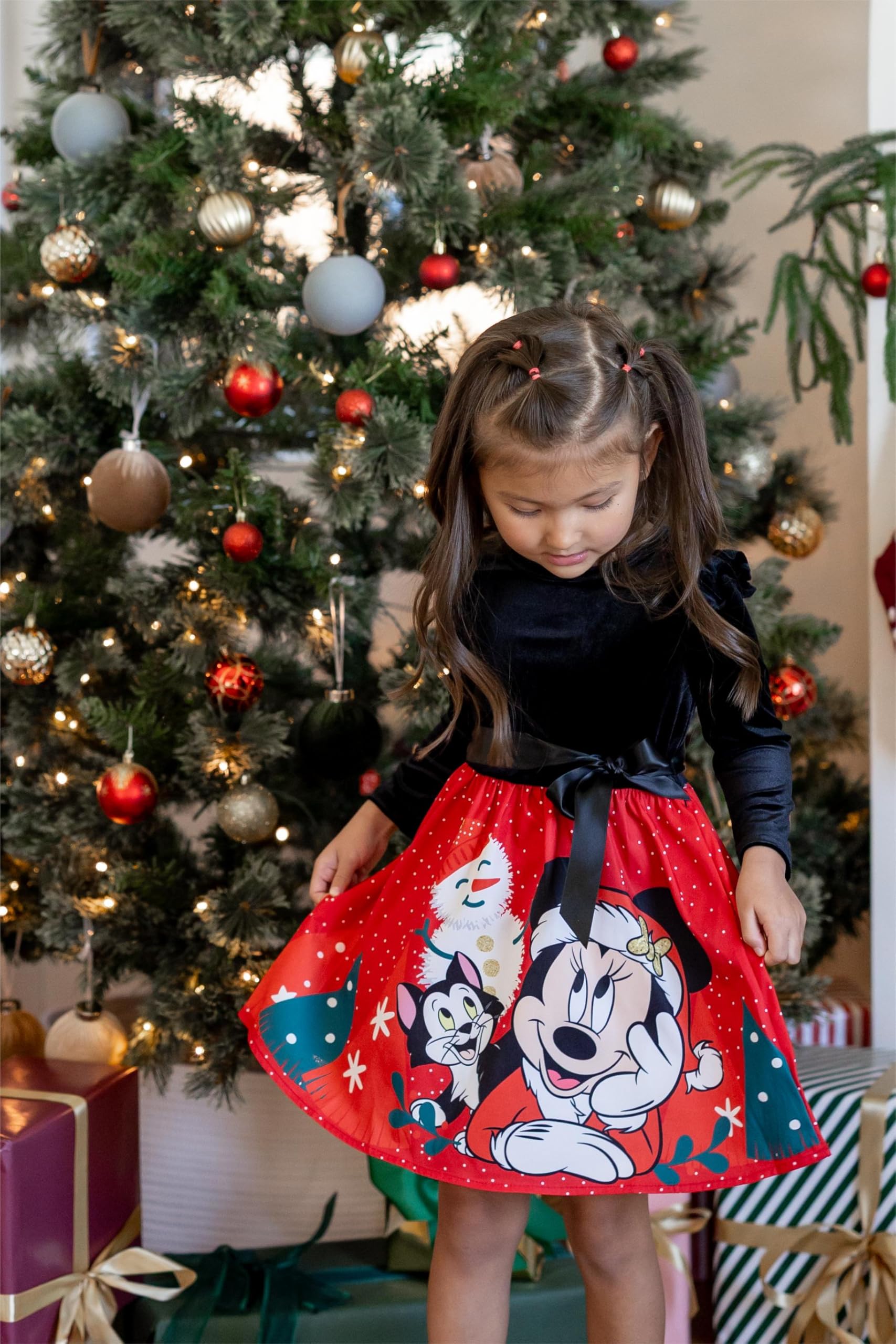 Festive Minnie Mouse Christmas Dress for Girls: Make her holiday season extra special with this charming long-sleeve dress featuring Minnie Mouse in a Santa outfit, joined by her adorable cat Figaro. The soft black velvet top adds a cozy, classic touch, while the red skirt sparkles with festive cheerβcomplete with snowflakes, trees, and a glittery snowman. Finished with flutter sleeves and a satin bow at the waist, itβs the perfect outfit for Christmas photos, parties, or holiday magic at home