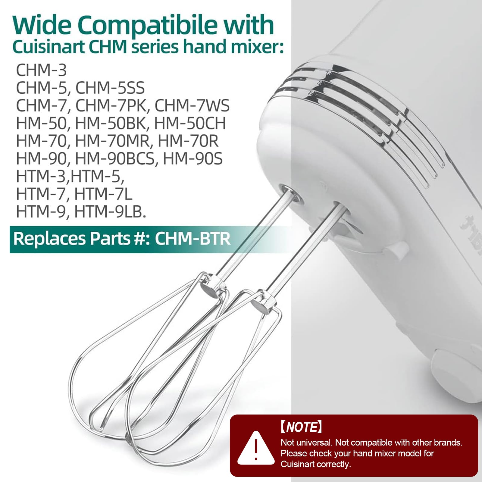 Compatible Models: The hand mixer beaters attachments replace parts # CHM-BTR for Cuisinart CHM series hand mixer. The blender replacement parts are made exactly fit for CHM-3, CHM-5, CHM-5SS, CHM-7, CHM-7PK, CHM-7WS, HM-50, HM-50BK, HM-50CH, HM-70, HM-70MR, HM-70R, HM-90, HM-90BCS, HM-90S, HTM-3, HTM-5, HTM-7, HTM-7L, HTM-9, HTM-9LB. γNOTEγThe hand mixer beaters for cuisinart is not universal. Not compatible with other brands. Please check your hand mixer model for Cuisinart correctly.