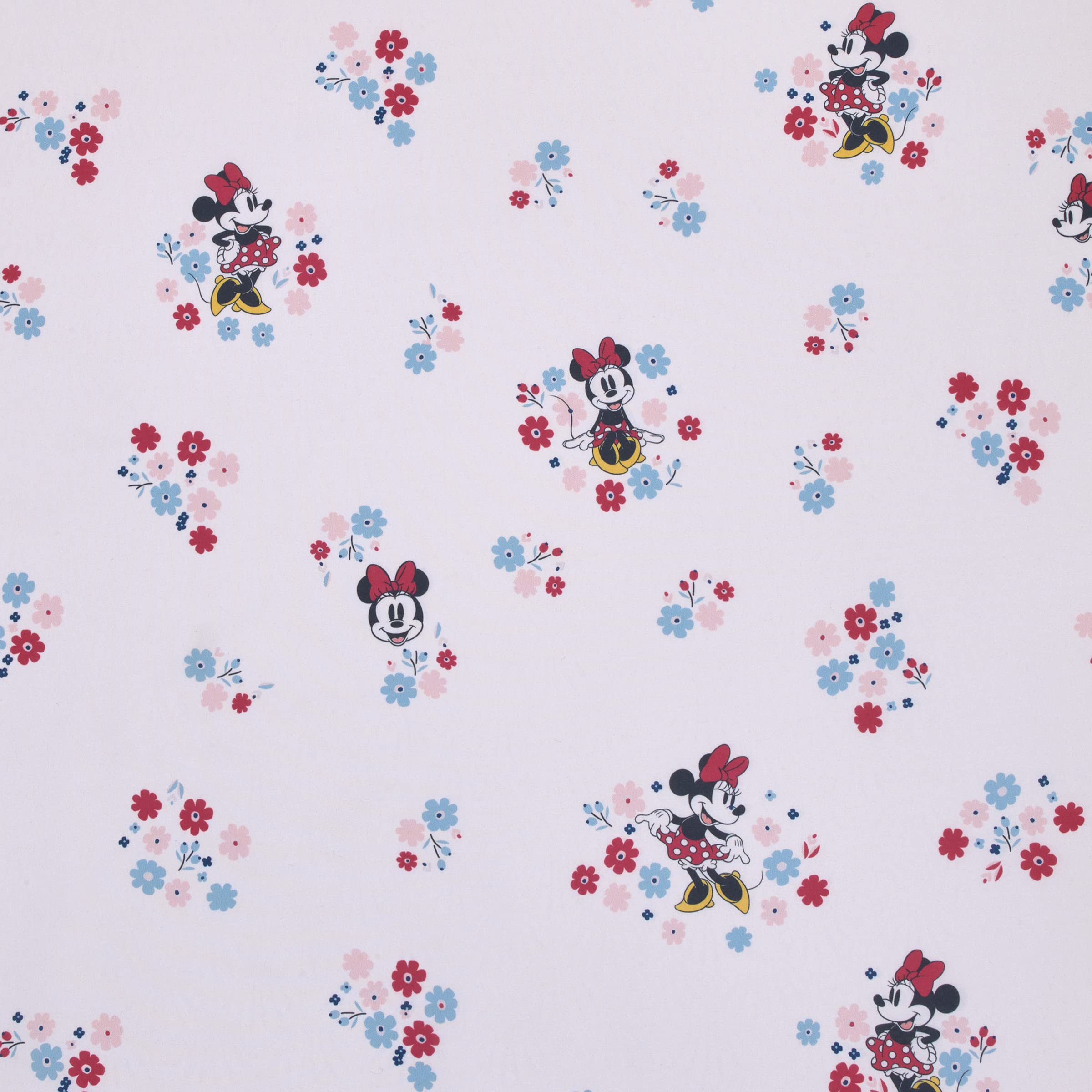Add springtime bouquets to your nursery with the Disney Minnie Mouse Small Town Floral Fitted Crib Sheet. Features Minnie Mouse among beautiful floral bouquets with flowers in shades of pink, blue, bright pink and white. Includes full elastic edges for a safe and snug fit. Made of cozy soft fabrics and measures 28" x 52" x 8". Fits a standard size crib/toddler mattress. Machine washable for easy care. The perfect touch for any Disney nursery!