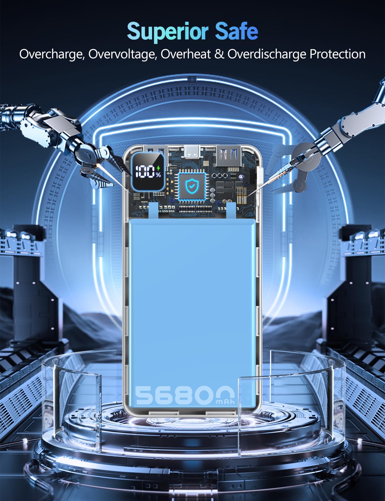 56,800mAh Ultra-High Capacity β Multi-Day Power Backup: Equipped with a massive 56,800mAh portable charger, this power bank ensures uninterrupted usage for days. It can keep your iPhone 16/15/14/13 series up to all day or keep a tablet powered for multiple full cycles. Ideal for camping, long-distance travel, or extended work trips where access to outlets is limited. Due to its extremely large capacity, this power bank cannot be carried on airplanes and is best suited for road trips, outdoor adventures, or emergency backup at home.
