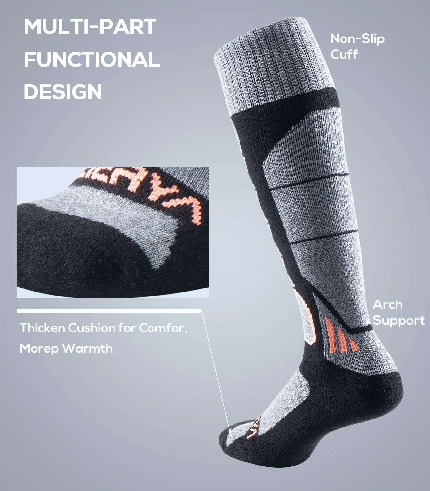 Arch Support for Secure Fit: The elastic arch band delivers targeted compression to keep your warm socks firmly in place, preventing slippage and ensuring stability during intense outdoor sports activities like skiing or hiking.