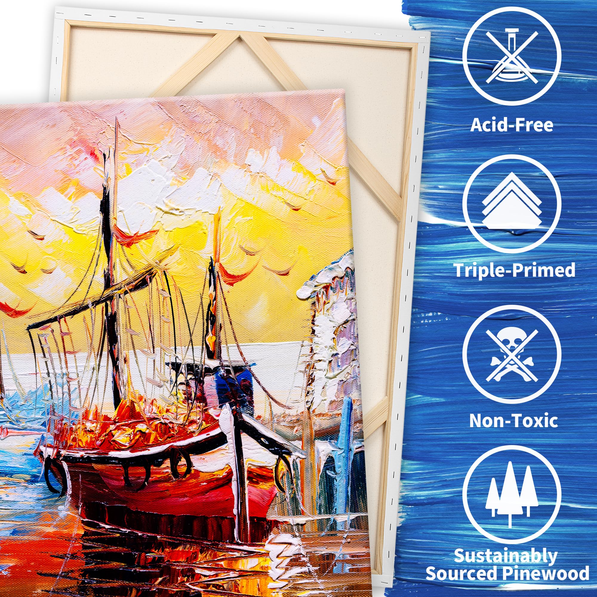 100% PURE COTTON CANVAS: Cotton Makes the Ideal Art Surface.It is made of cotton without rinsed with any alkaline chemicals,it keeps the natural tone and the fiber flexibility of the cotton yarns with high tension strength,so brushes just glide right over them and make painting effortless.