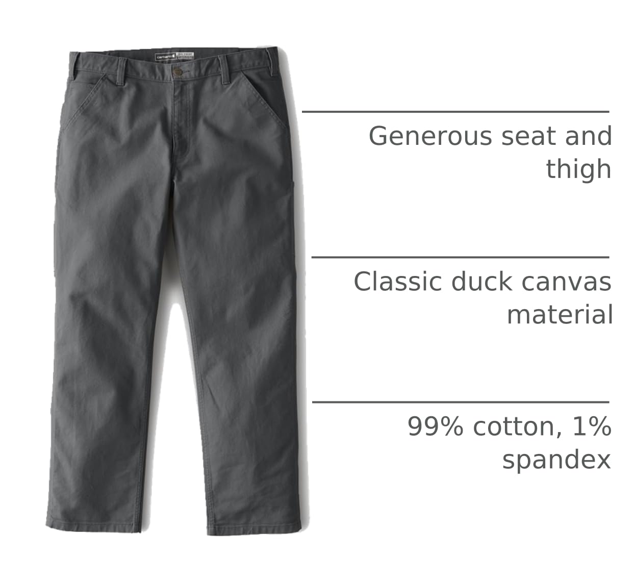 Description A workwear essential for any trade, these men's pants feature Carhartt's classic duck canvas with built-in flex for easy movement. Multiple tool pockets and a utility loop keep workday essentials within reach. A loose fit creates a generous fit through the seat and thigh for easy movement