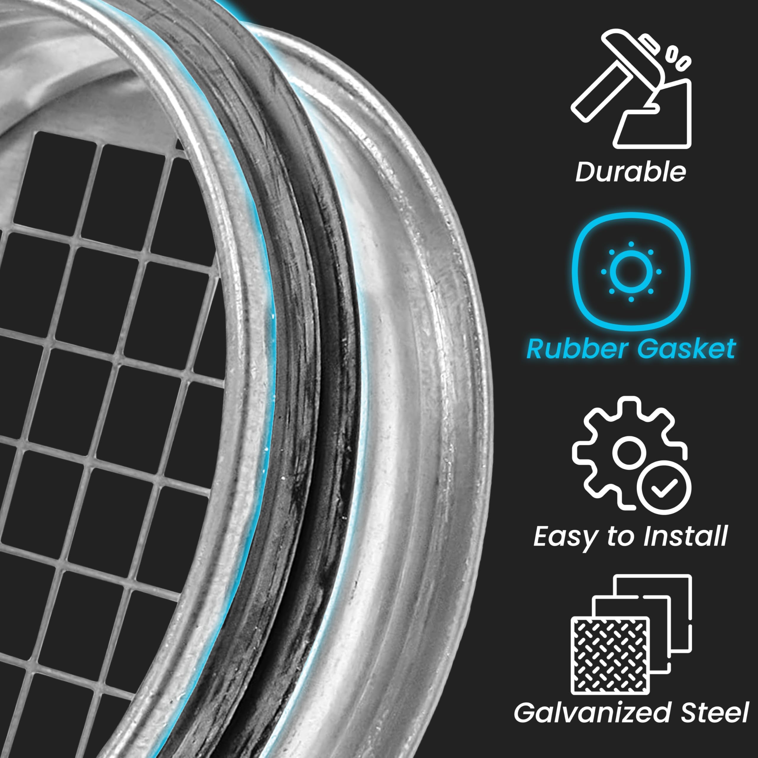 4" Inch duct cap end with protective steel mesh and rubber gasket for tighter fit. Mesh hole size - 3/8" x 3/8" Inches. Depth of the cap - 1.3" Inches. Inner diameter - 3.93" Inches. Material - Galvanized Steel.