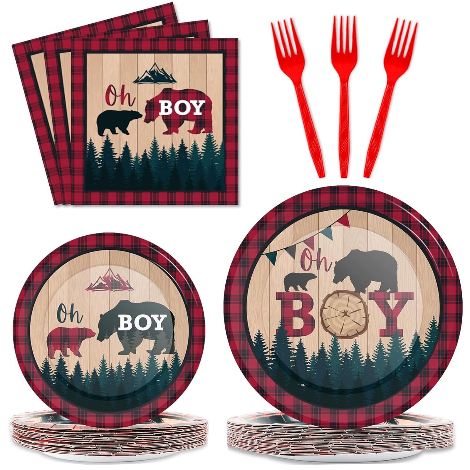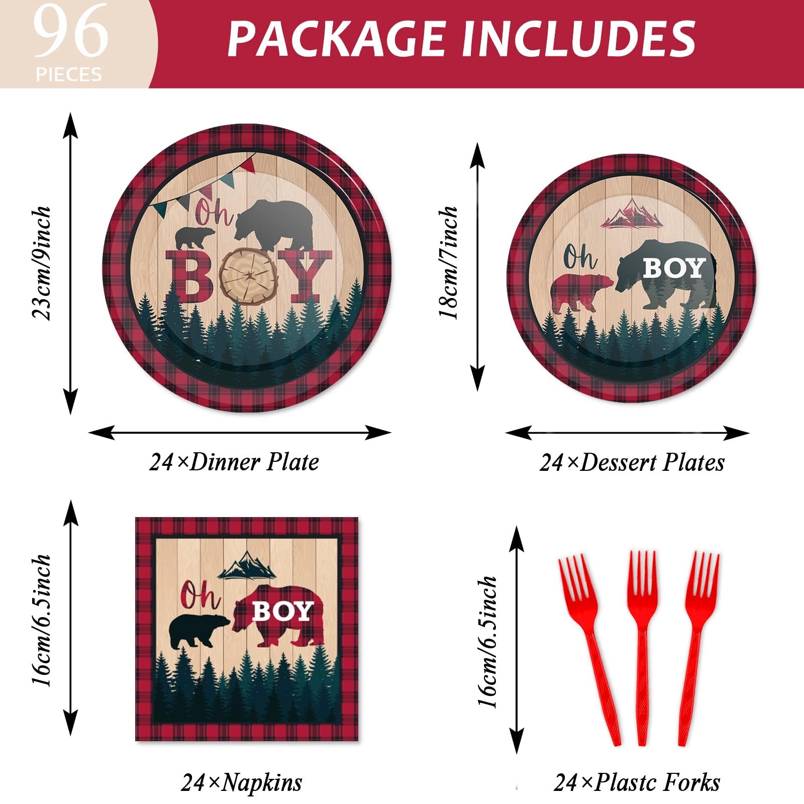 【Buffalo Plaid Oh Boy Party Supplies】You will receive 24 pieces Oh Boy baby shower party paper dinner plates of 9’’, 24 pieces plates of 7’’, 24 pieces red plaid napkins of 6.5’’ and 24 plastic red forks for each set that can serve 24 guests