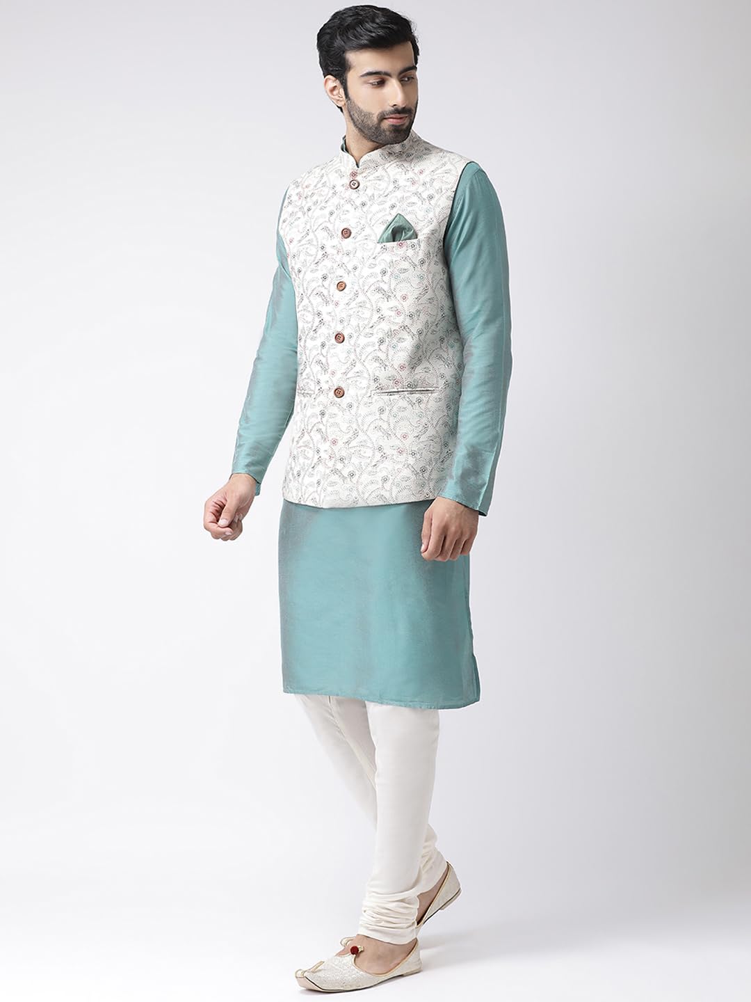 Kurta: Tailored in a rich cotton blend fabric, blue kurta offers a subtle shine and comfortable fit, perfect for day-long wear. Nehru Jacket: The intricately embroidered white floral jacquard Nehru jacket adds a touch of luxury with its detailed patterns, complementing the kurta for a complete ethnic look. Pants: Paired with slim-fit off-white churidar with adjustable drawstring closure for a polished finish.