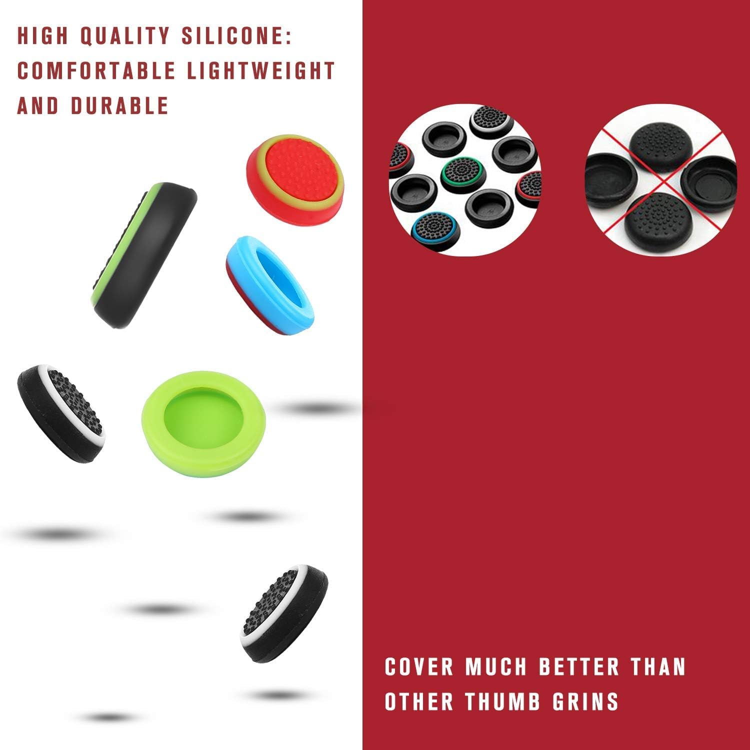 ENHANCE GAMING EXPERIENCE: Personalize and enhance your gaming experience with our upgraded silicone thumb grip caps. With the Anti-skid function, you will no longer have to worry about slipping off the analog stick of your controllers, and provide more accuracy and sensitivity, give you the most complete game pleasures.