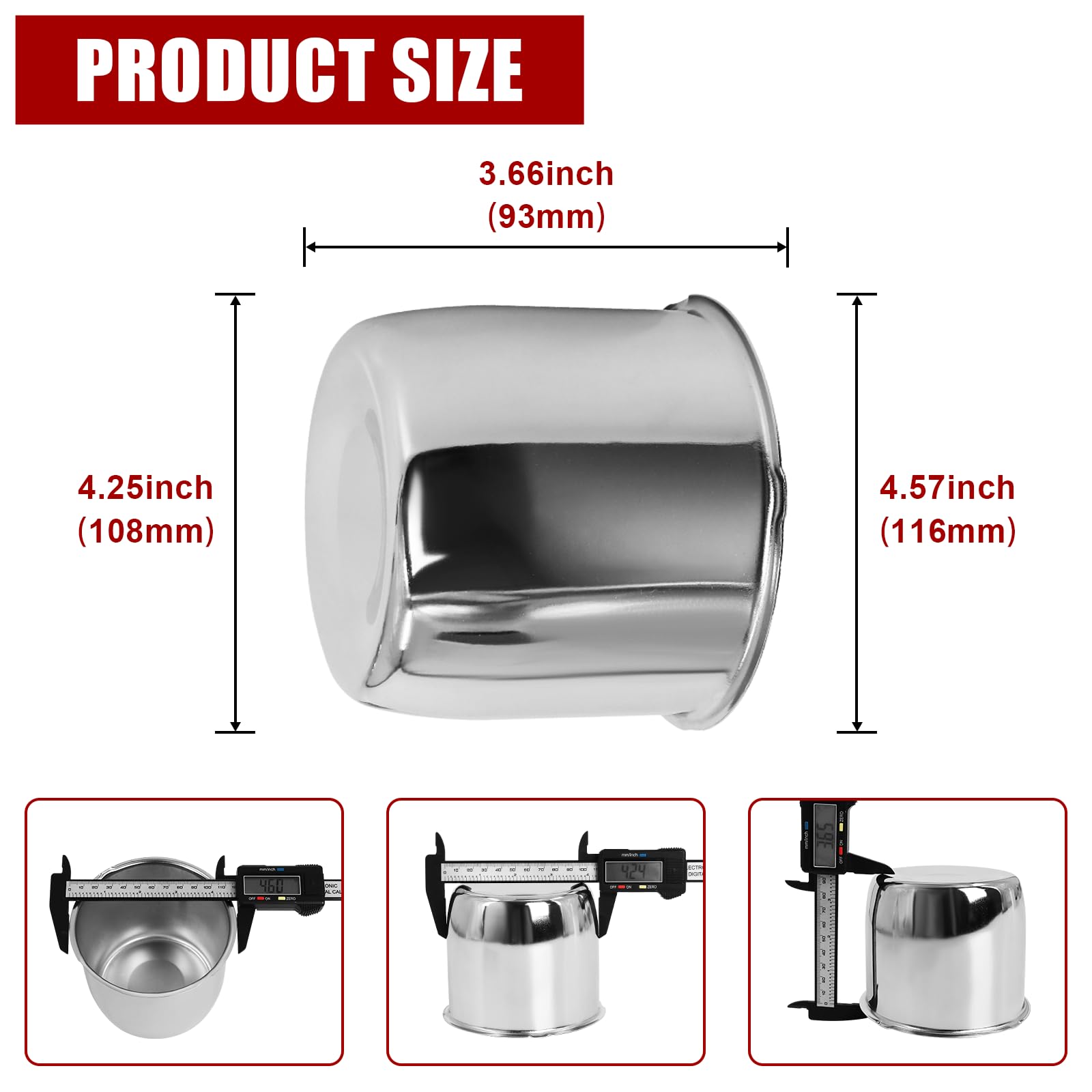 ACCURATE DIMENSIONS: The outer diameter is 4.25" (with the bottom lip 4.57"), and total height 3.66". These precise measurements ensure a perfect fit for your wheels, so you don’t have to worry about compatibility issues.