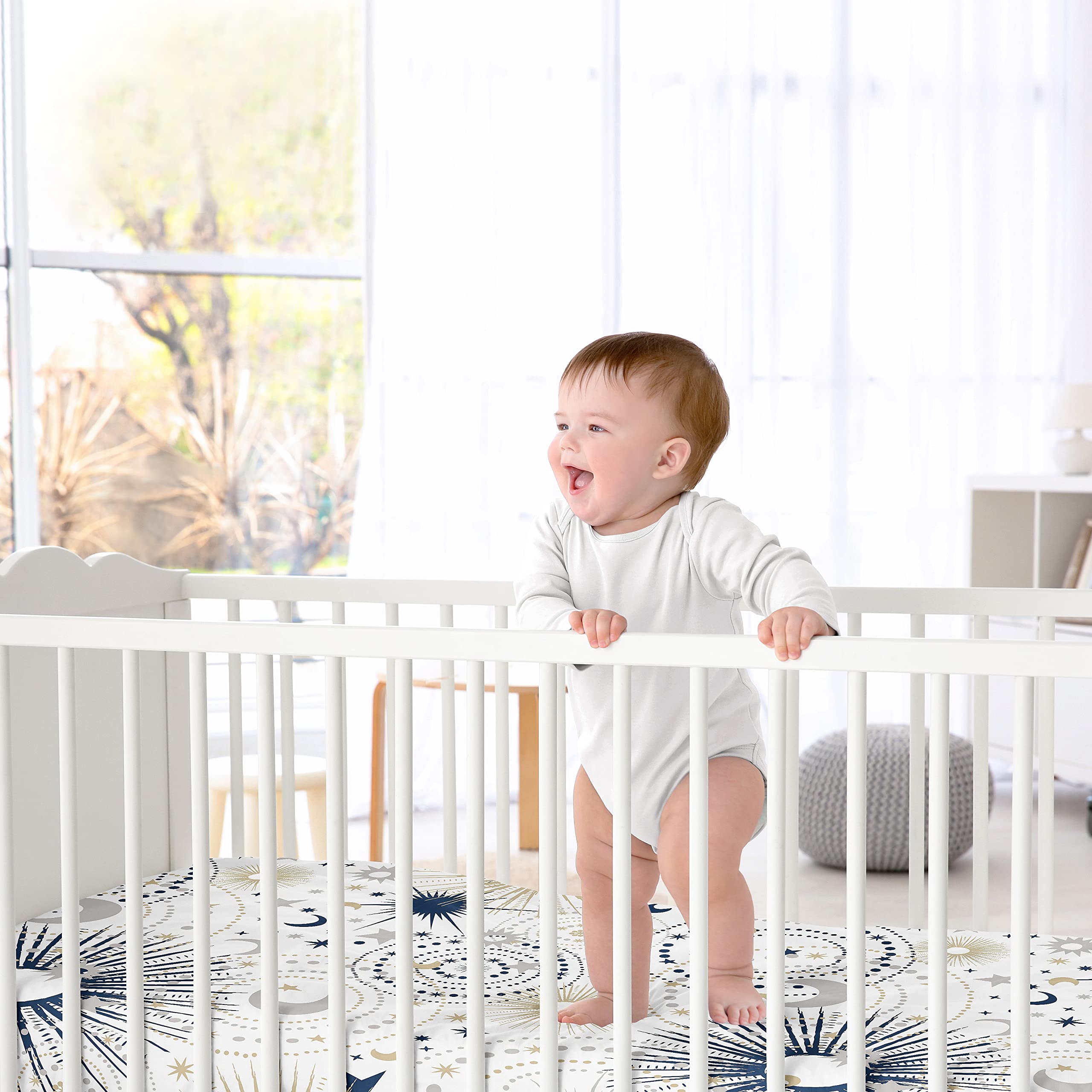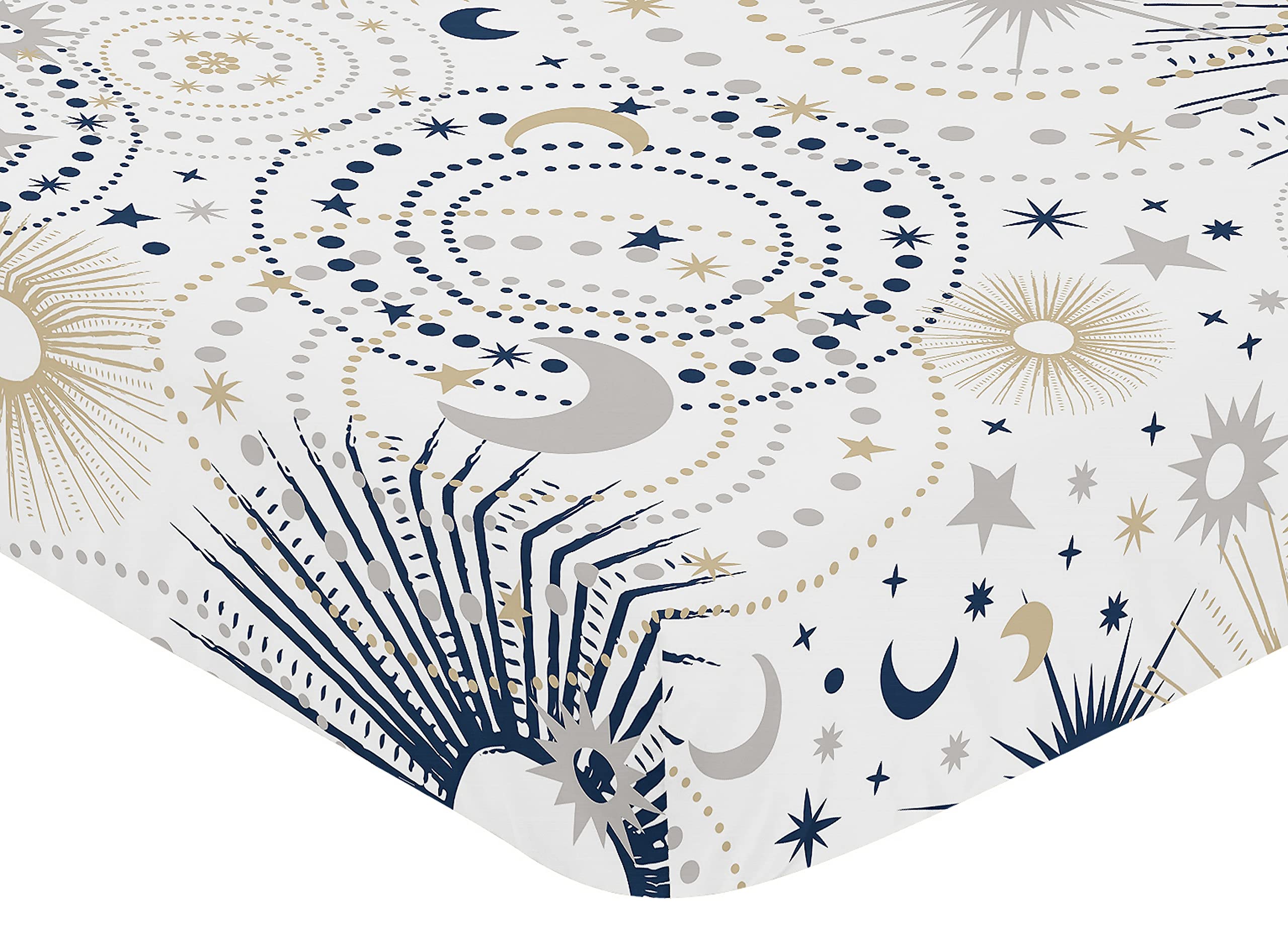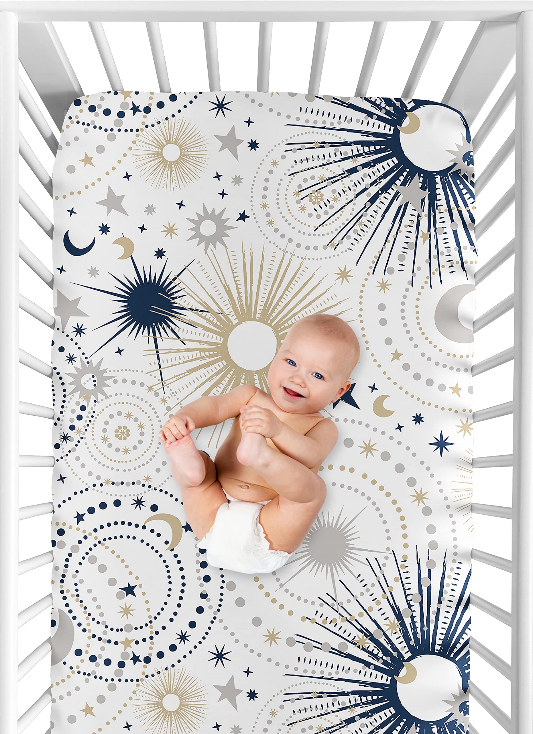 SNUG FIT: Includes (1) Fitted Crib Sheet 52in. x 28in. x 8in. Our newborn standard crib sheets fit snugly, with premium elastic sewn around the entire bottom edge for a secure fit on most standard sized cribs and toddler beds, to reduce shifting and bunching. This brushed microfiber crib sheet features an exclusive design of a gender neutral navy blue, gold, grey and white celestial, stars, outerspace, sky, star and moon print & is gentle on delicate skin to foster a soothing sleep environment.