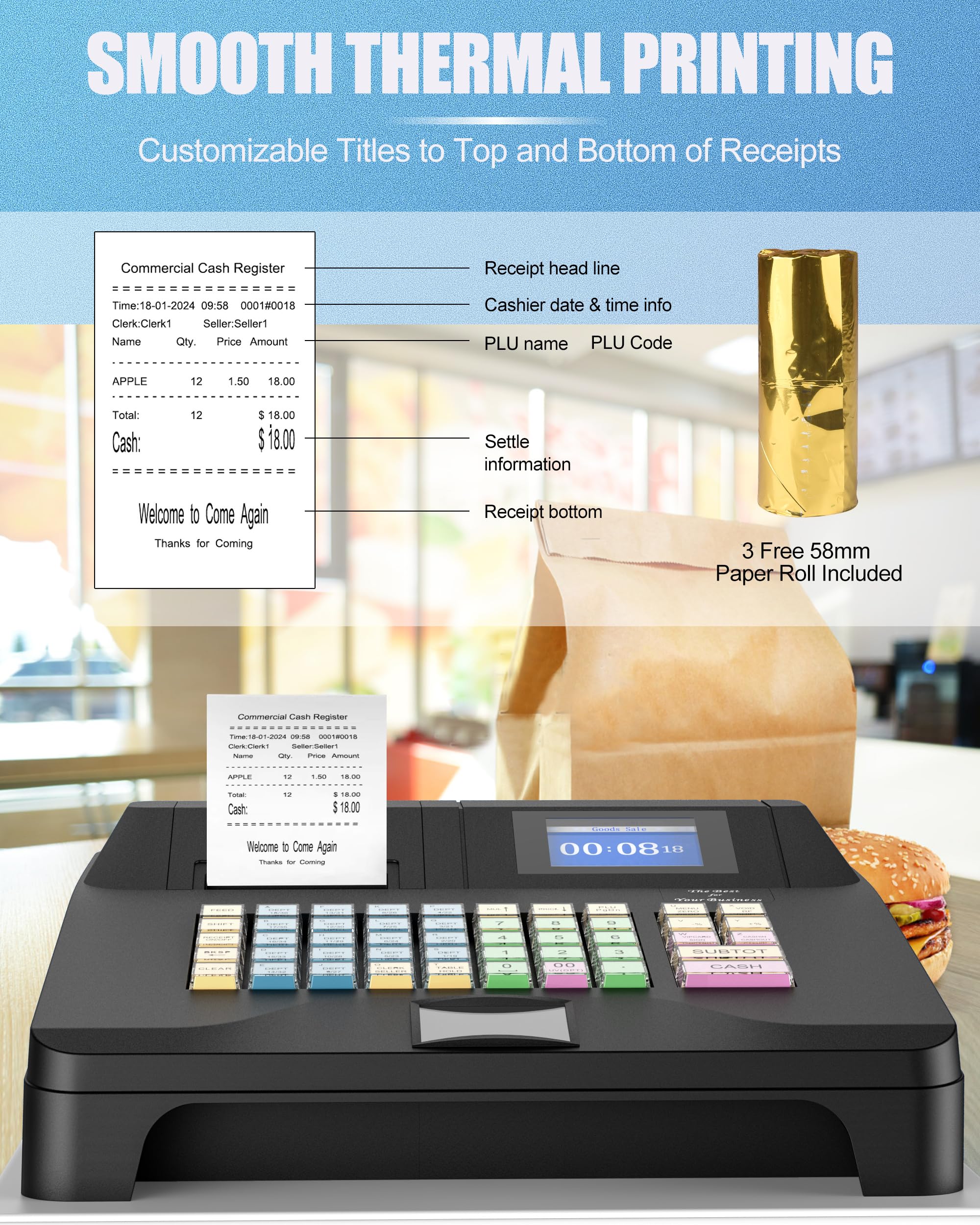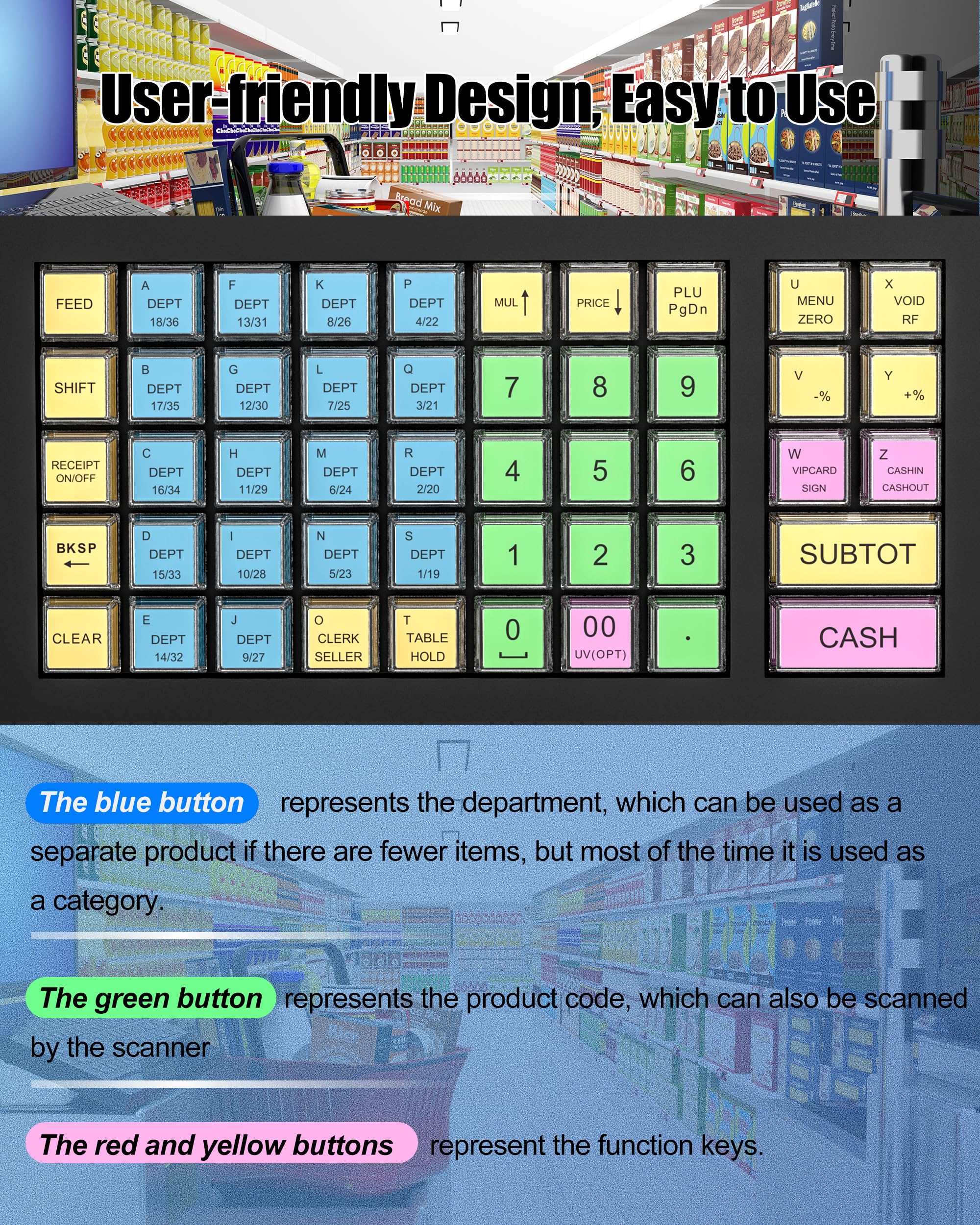 ๐ฏใ ๐๐๐ฌ๐ฒ ๐ญ๐จ ๐๐ฌ๐ใ:User-friendly Design, Our keyboard is designed to differentiate functions by color, making it simpler for teens and senior and easier to operate. Smart Cash Register with end of day totals, sales, inventory tracker. Supports 'One Click Tax Free' , Perfiware cash registers with one-touch tax-free settings, which allows you to quickly exempt those who are exempt from tax. (If you don't know how to set this up, you can check the User manual tax settings).