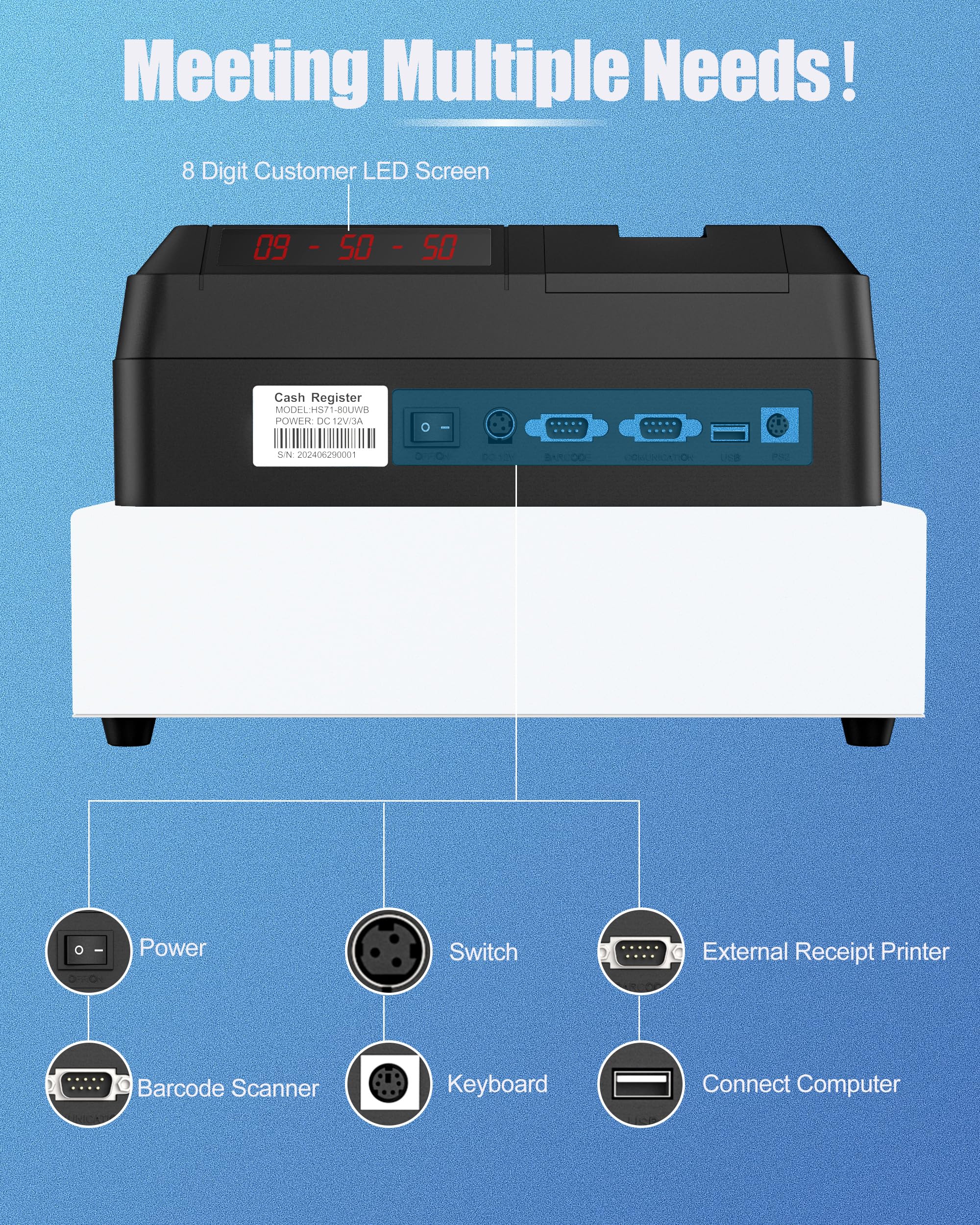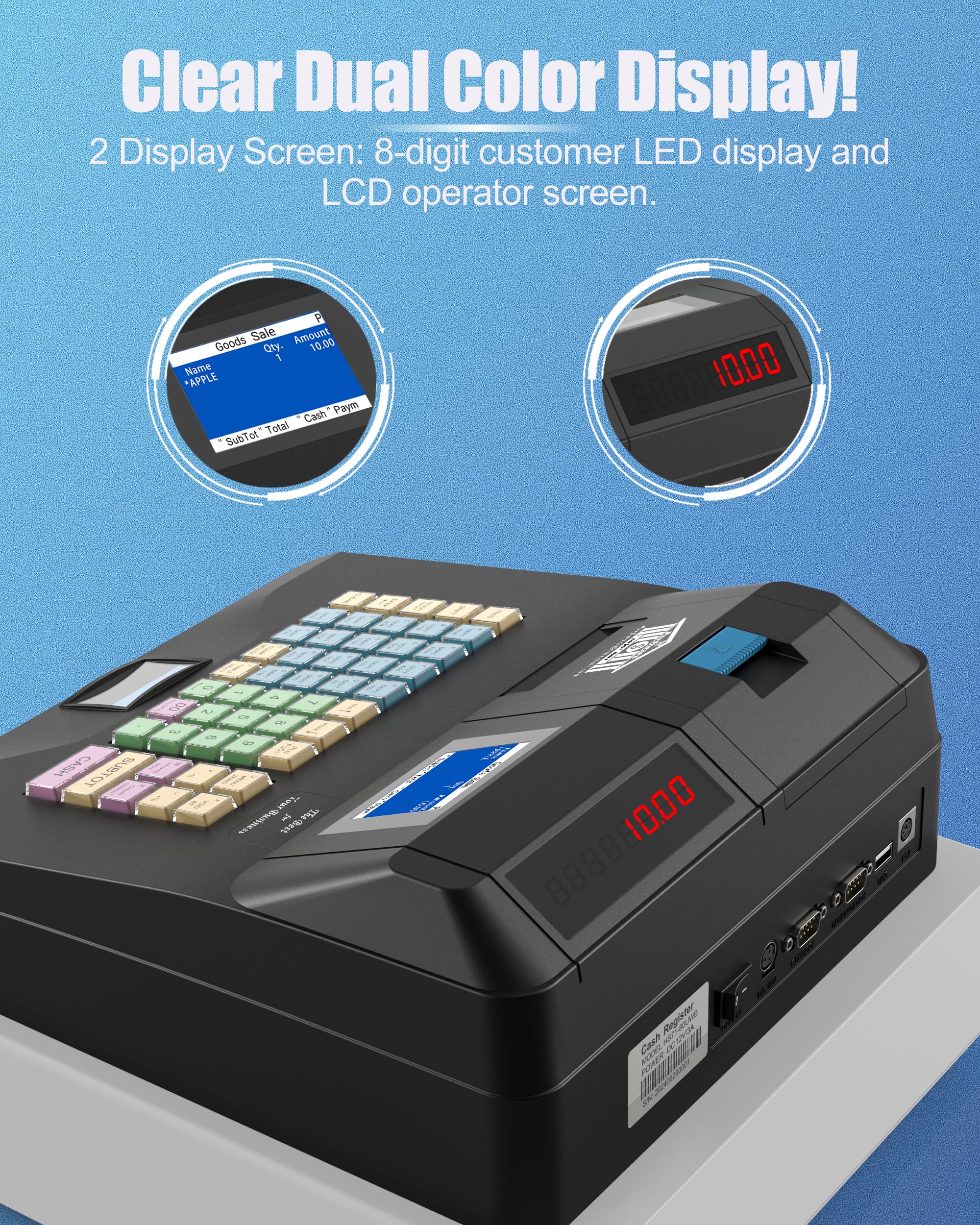 โ ใ๐๐ฎ๐๐ฅ ๐๐ข๐ฌ๐ฉ๐ฅ๐๐ฒ๐ฌใ: This cash register is equipped with a 2.8-inch TFT LCD display for the cashier and an 8-digit LED display for customers, ensuring clear and accurate transaction information is presented to both.