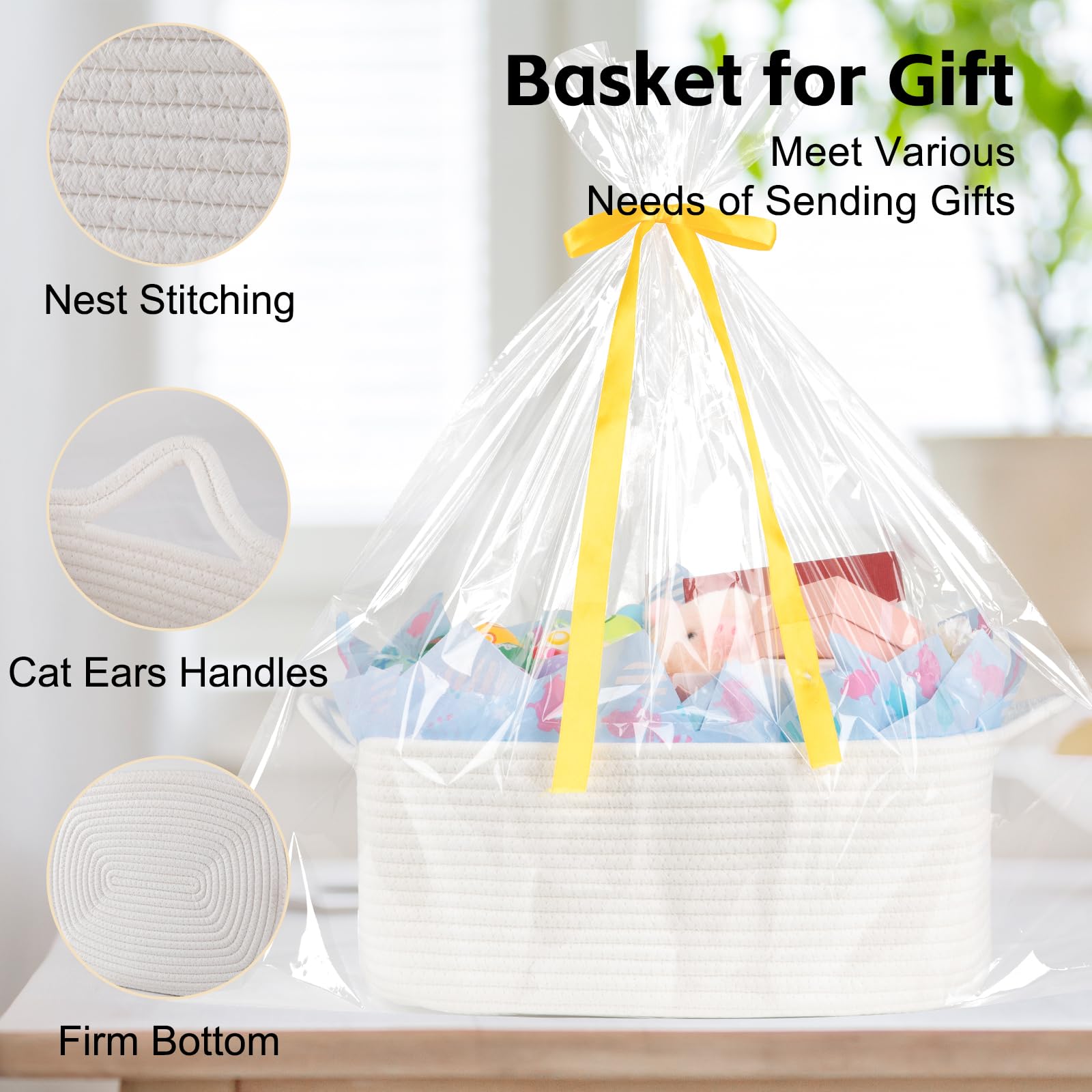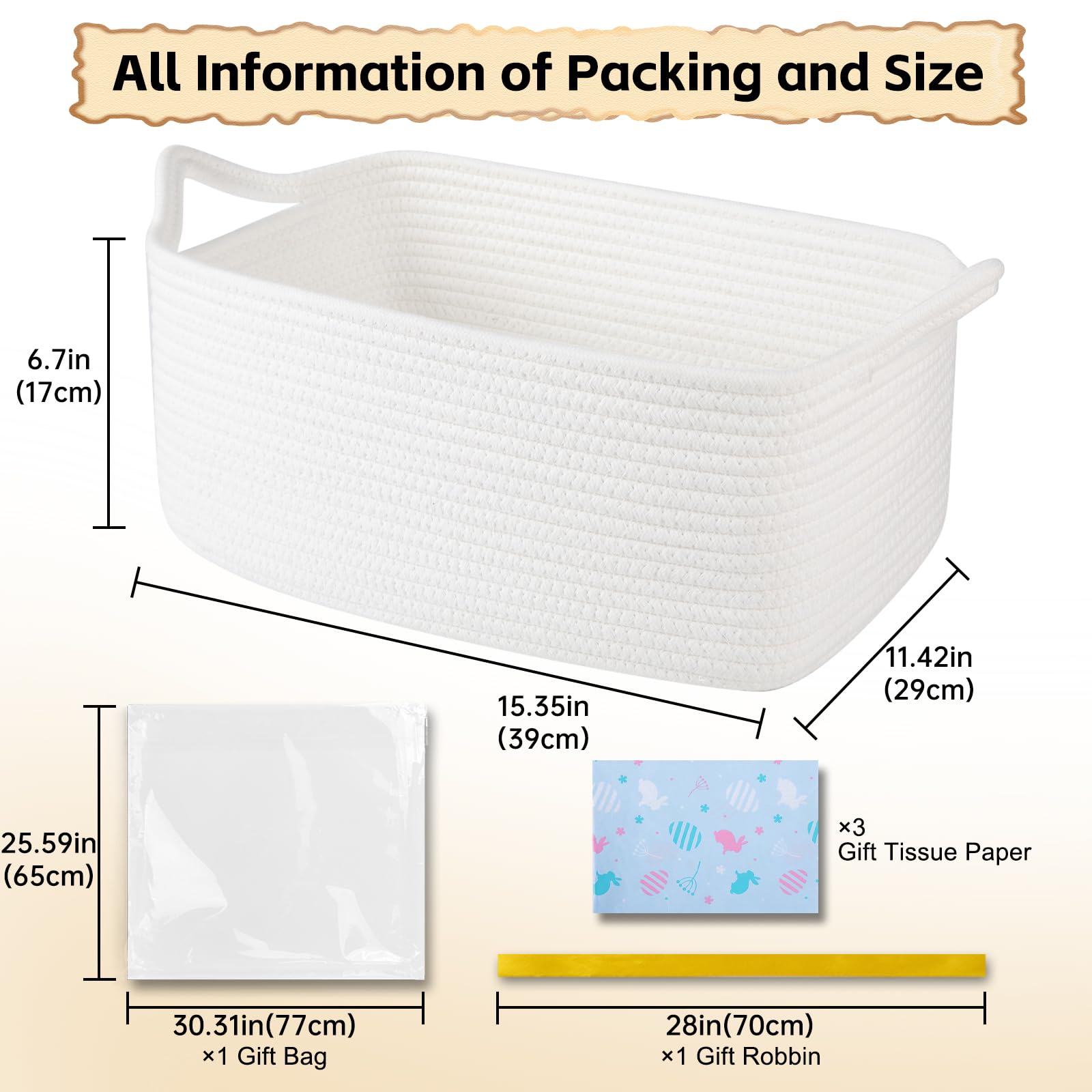 Safe Material: The basket is 15.35L*11.42W*6.7H and made of 100% pure cotton material, no chemical material, no odor, soft and skin friendly. It is no sharp edges that may scratch the floor, especially suitable for children and pets.We are passionate about providing you and your family with a healthy and clean home atmosphere