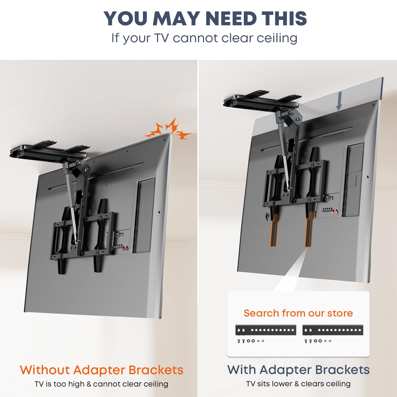 Space-Saving & Modern – Retracts When Not in Use: When you’re done watching, the mount folds your TV flat against the ceiling, freeing up floor and wall space. Enjoy a clean, minimalist look in any room — perfect for living rooms, bedrooms, home offices, RVs, or game rooms