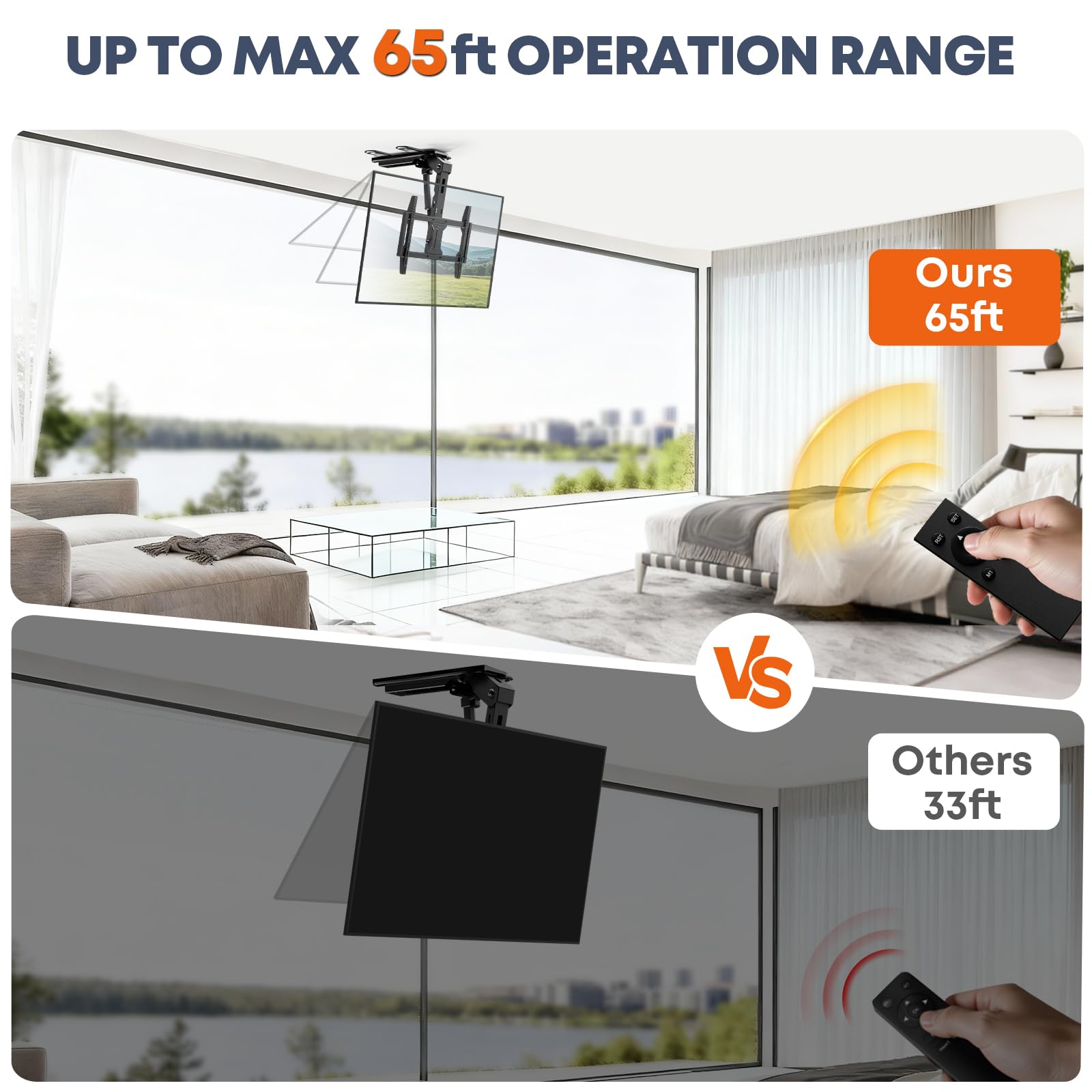 Smooth Motorized Drop – Stop at Any Viewing Angle: Lower your TV from the ceiling with the included wireless remote. It takes up to 25 seconds to fully extend to the maximum 80° angle, but you can stop at any height to match your perfect viewing angle. The quiet motor ensures distraction-free movies, gaming, or video calls