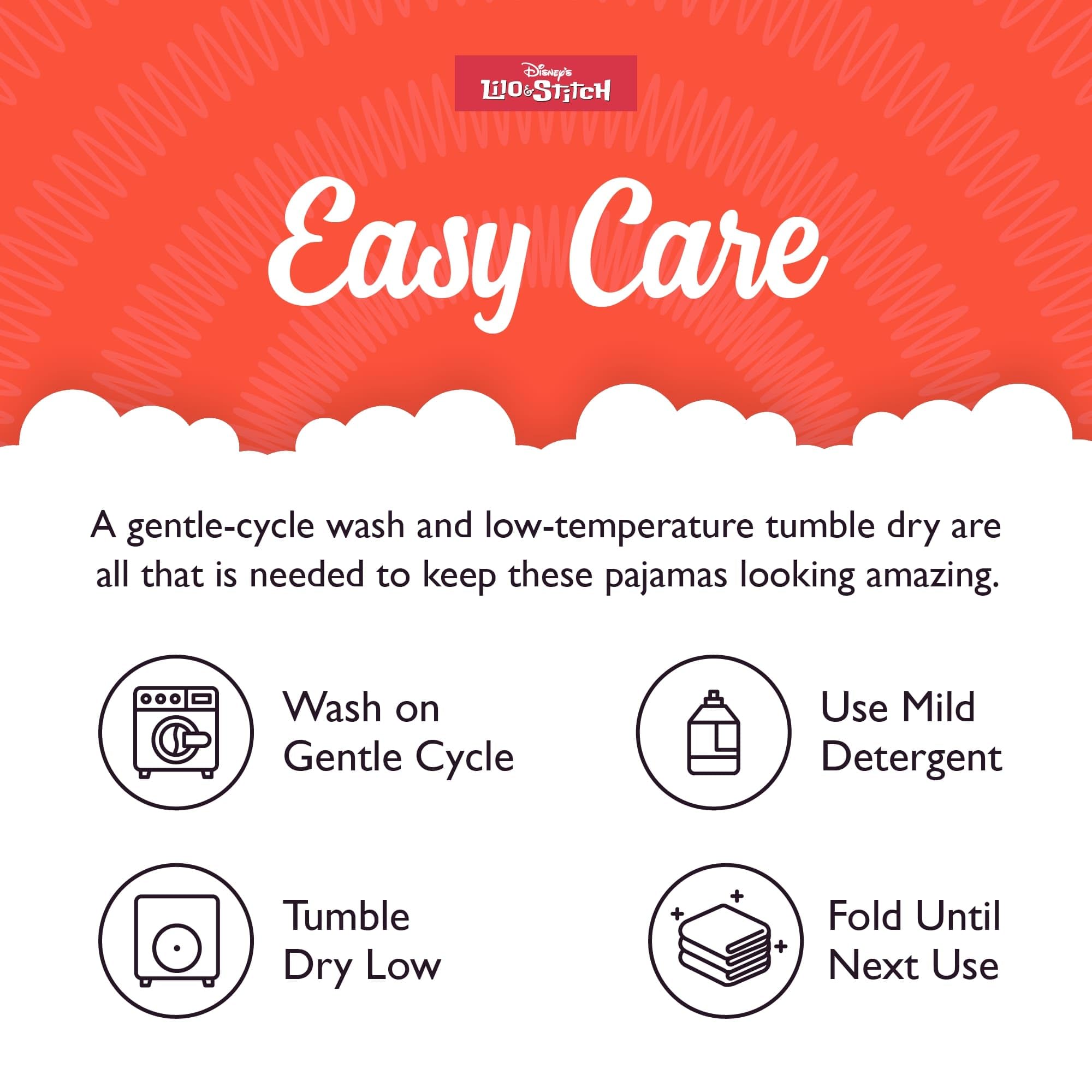 EASY CARE: Made from 100% cotton with expert stitching for added durability, this The Lilo & Stich pajama set will withstand many nights of sleep and bedtime adventures. For best results, wash them with mild detergent on a gentle cycle and tumble dry on low.