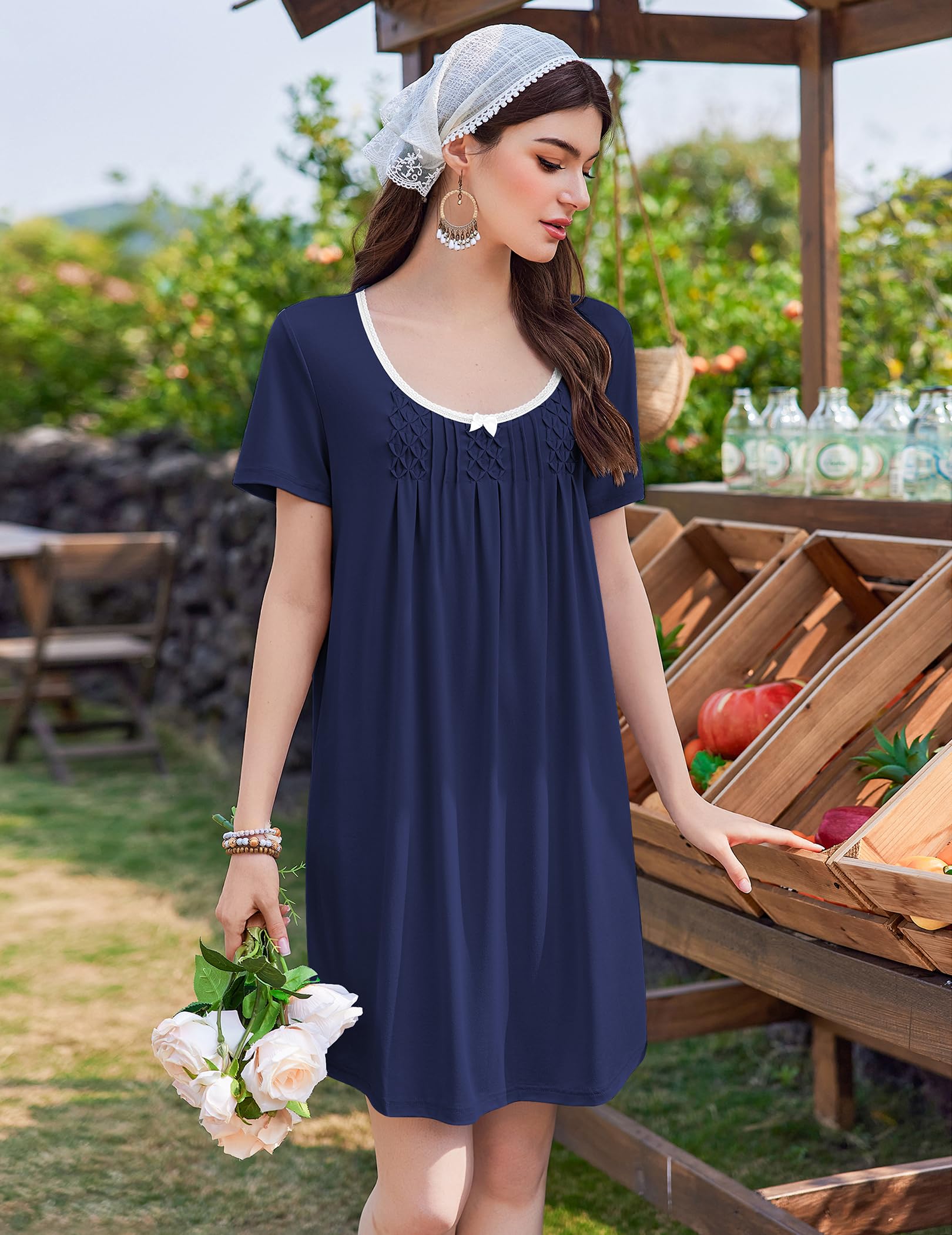 【Classic design】This loose fit sleepshirt features a graceful lace trim and a ribbon bow at scoopneck. The diamond pintucks and cute pleated front create an effortlessly flattering shape. A must-have night dress for your collection