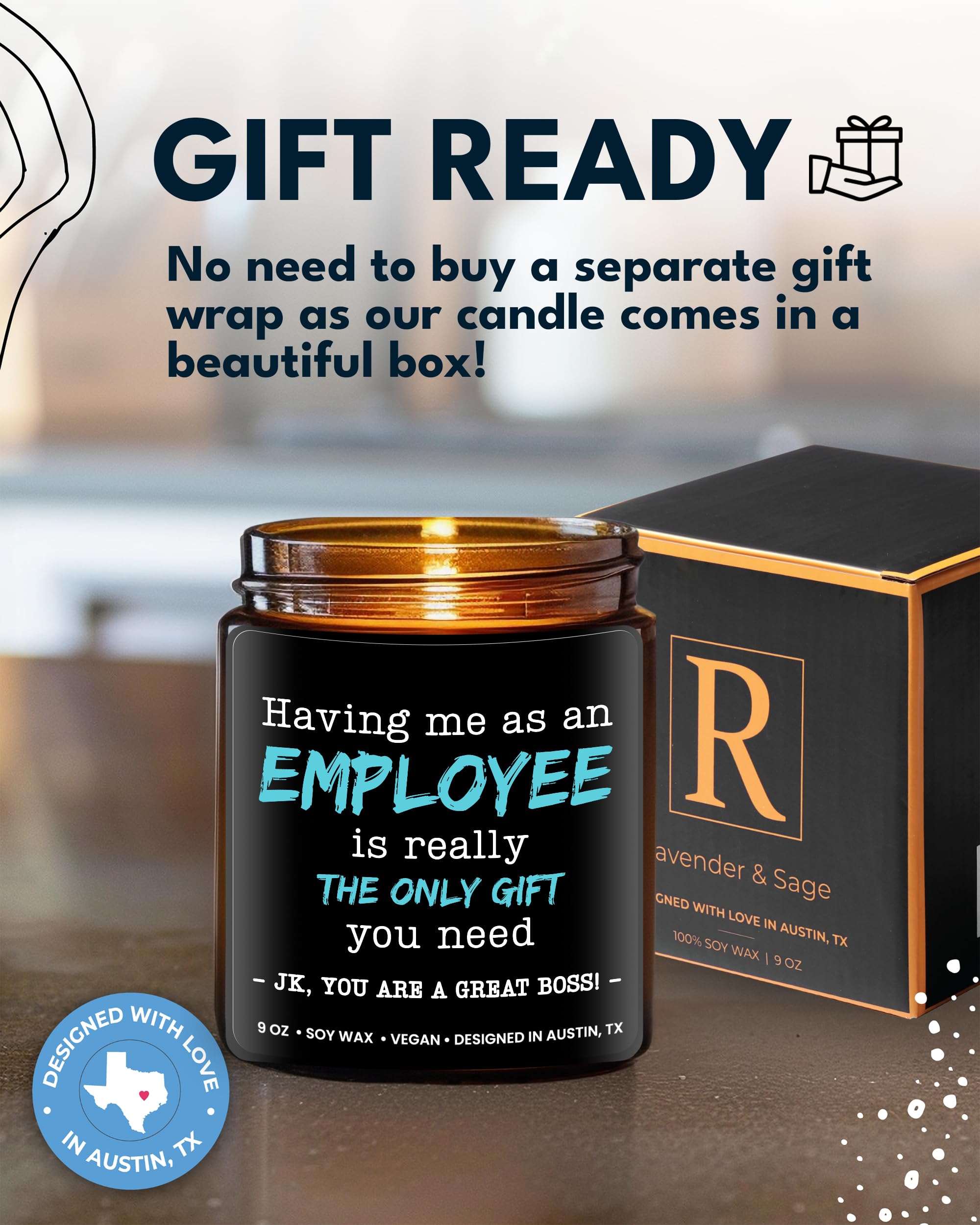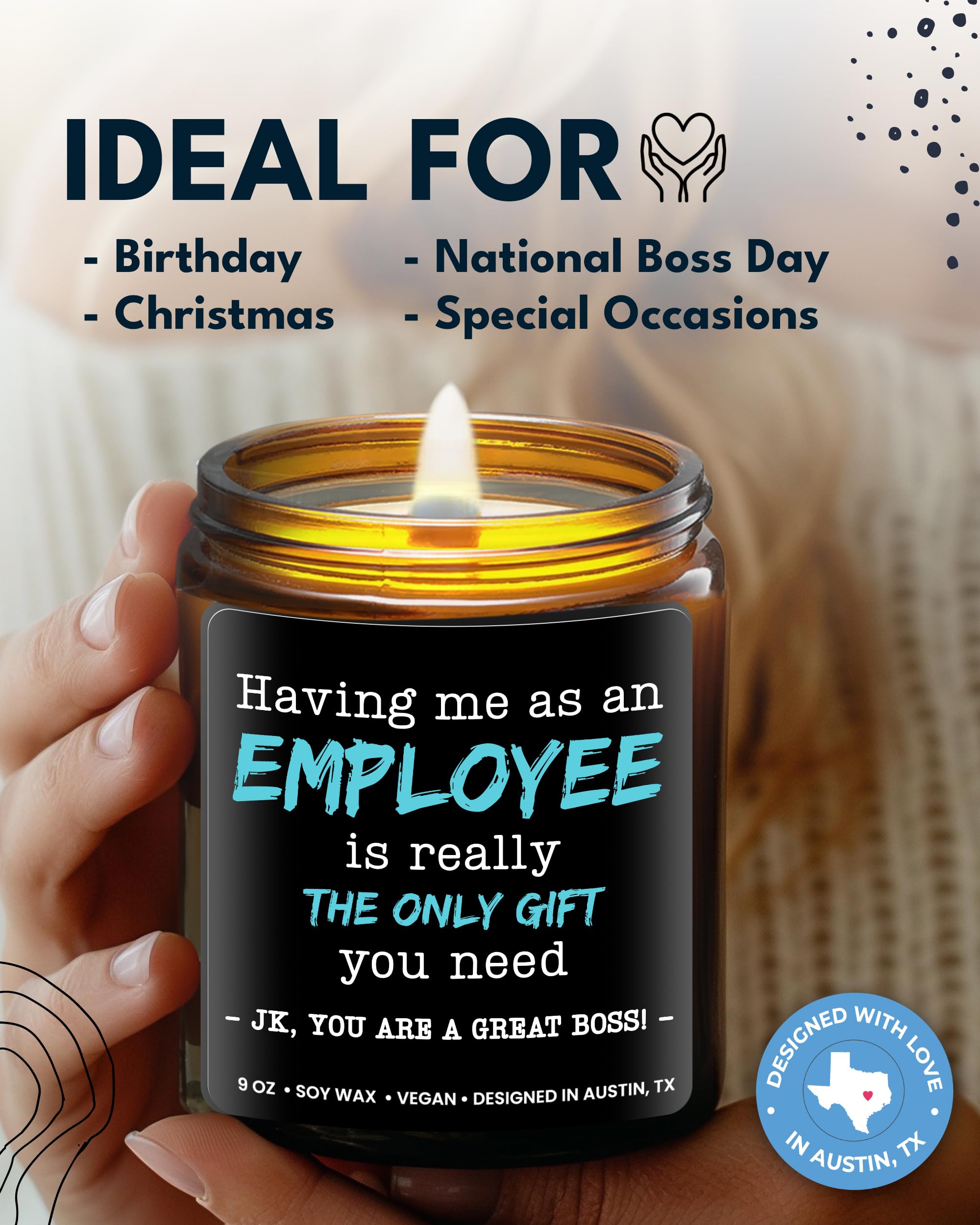 Funny Boss Candle - Show appreciation with the ultimate "Having Me as an Employee is the Only Gift You Need" candle. Perfect for boss gifts for men, this candle is one of the best boss gifts for men. Ideal for national boss day gifts for men, it's sure to bring a smile with its humor. A great choice for funny boss gifts, it's a perfect gag gift for boss. Celebrate their Birthday or Christmas with a unique and memorable gift that will leave a lasting impression.