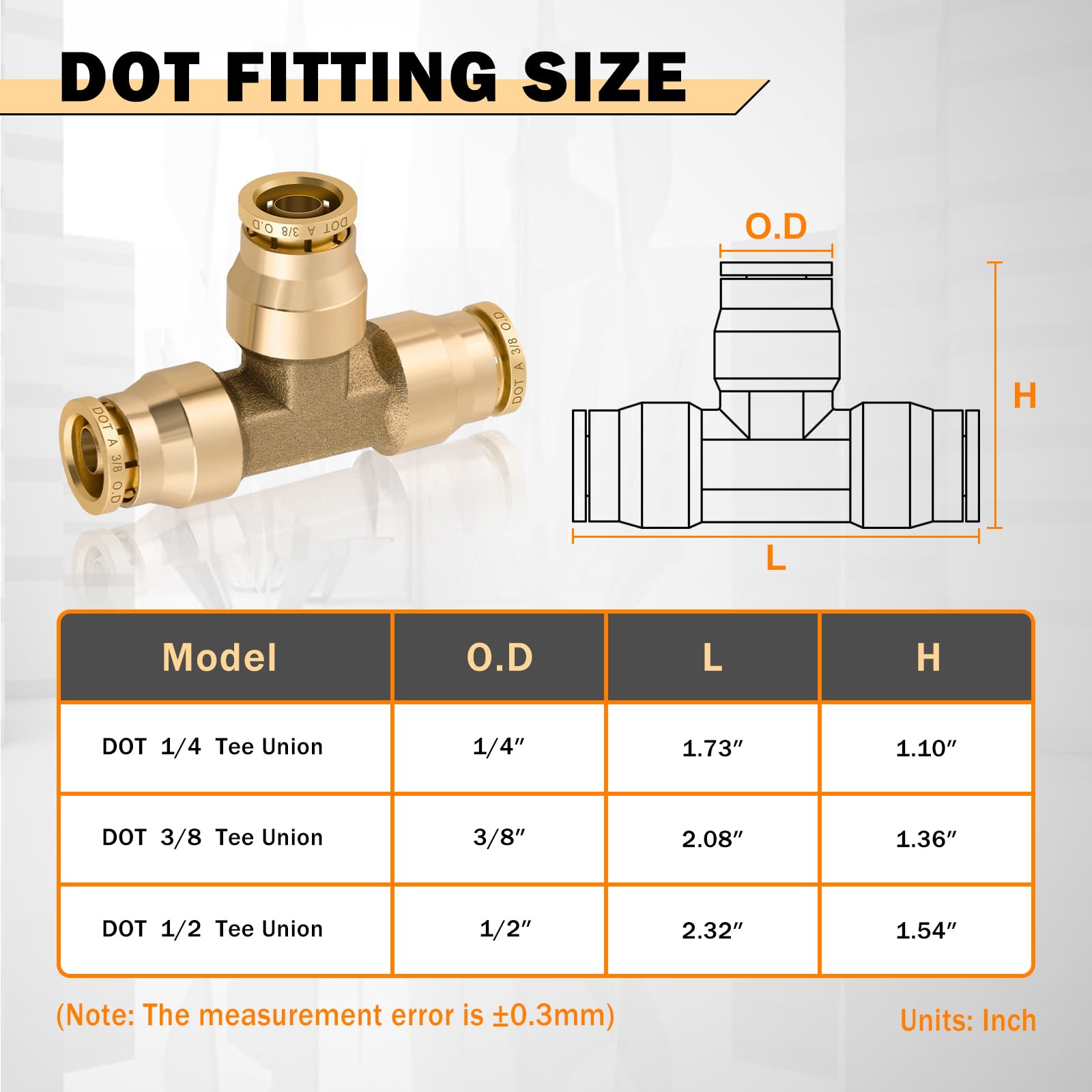 13 PCS PACKAGE: The 13 pcs DOT air brake fittings kit includes: 4 pcs 1/4 inch tee union DOT fittings, 4 pcs 3/8 inch tee union DOT fittings, 4 pcs 1/2 inch tee union DOT fittings, 1 pc tube cutter. DOT quick connect fitting assortment types: 1/4", 3/8", 1/2"