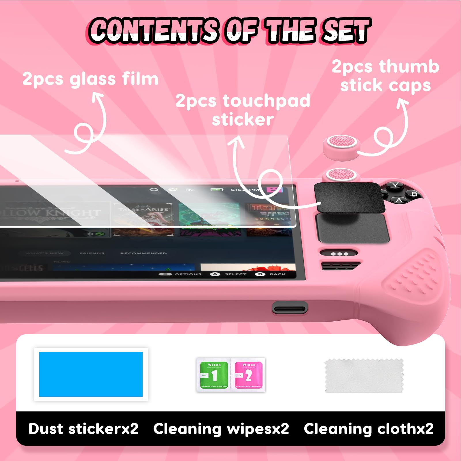 【360° Full Protection】 This steam deck oled protective case package includes 1*silicone case, 2*glass film, 2*cleaning set, 2*trackpad film and 2*thumb joystick caps can effectively provide reliable protection for your steam deck.