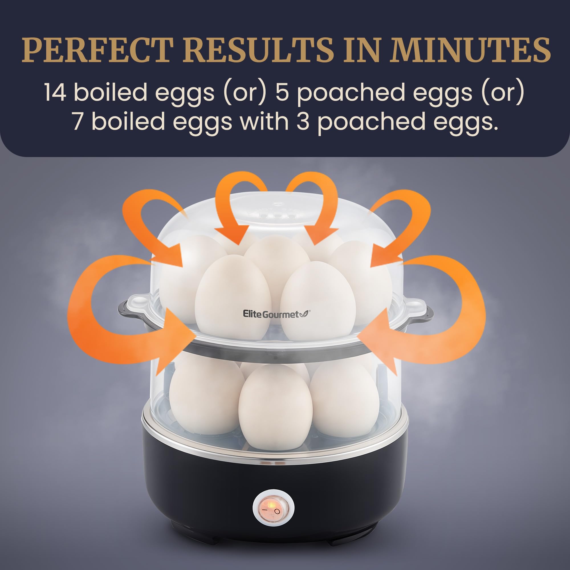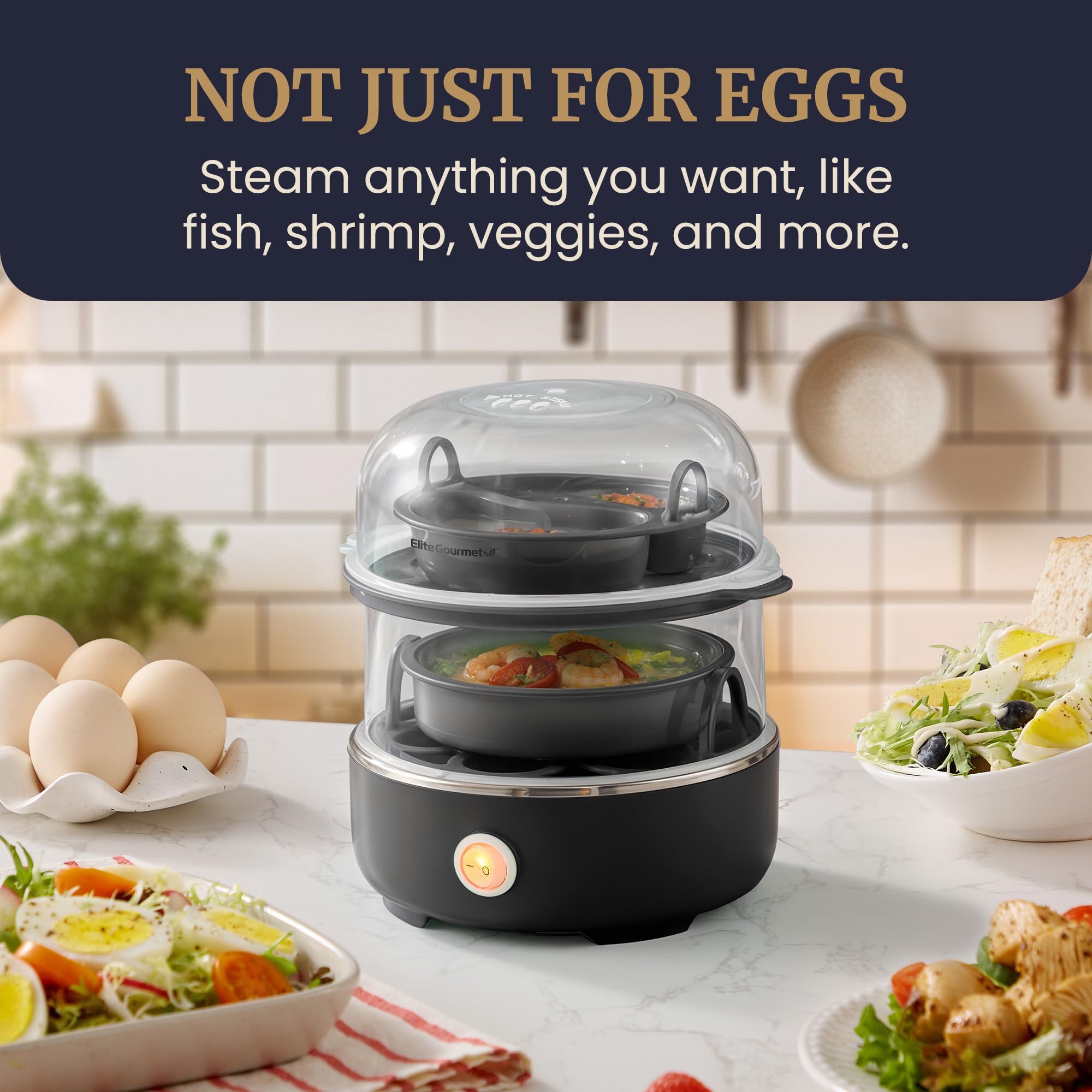 VERSATILITY: Whether pairing with avocado toast or preparing deviled eggs, the Elite Gourmet 2-Tiered Easy Egg Cooker is an all-in-one egg boiler, poacher & omelet maker as well as veggie or food steamer, and more!