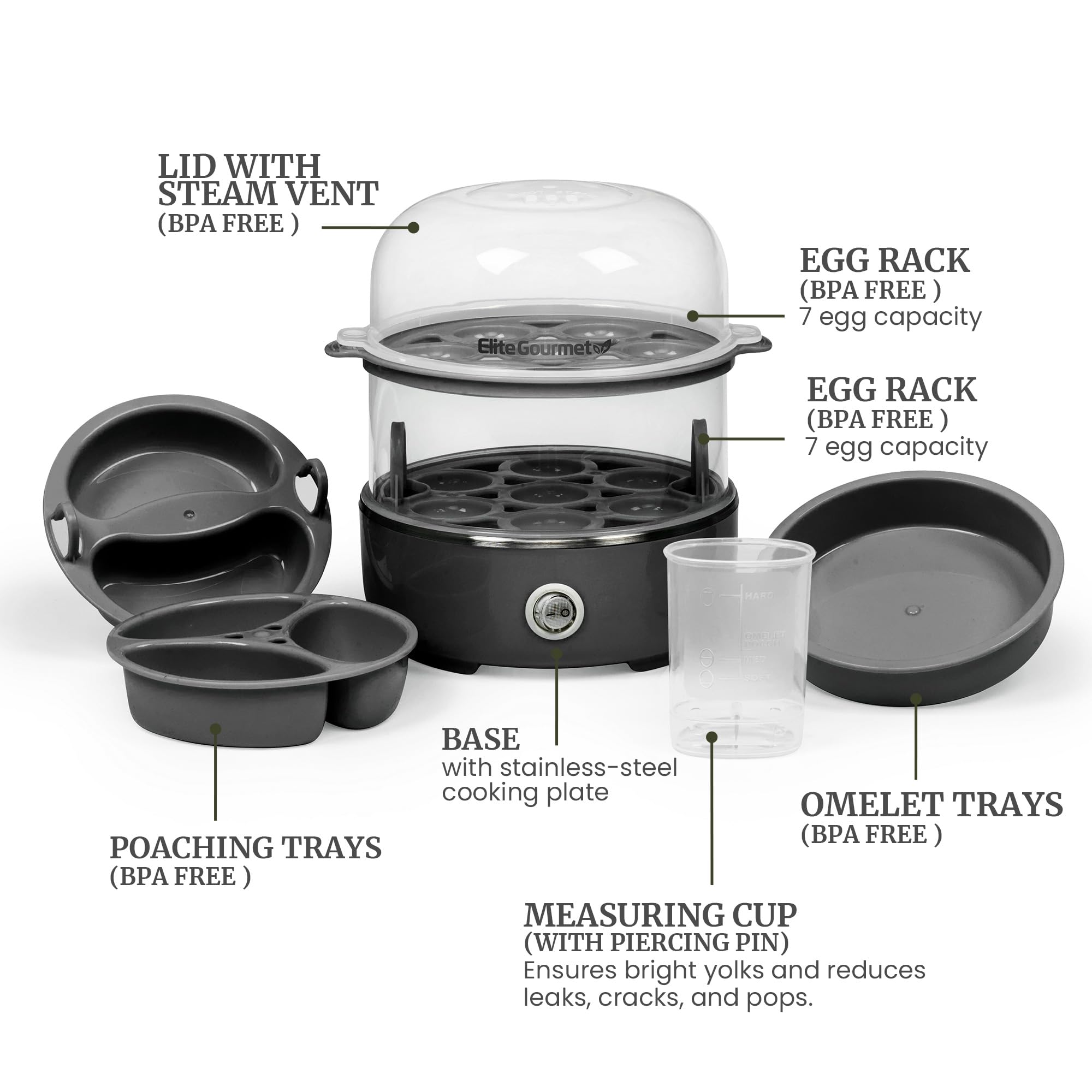 The Elite Gourmet Two-Tier Easy Egg Cooker cooks up to 14 eggs at one time. Eliminate the guesswork of stovetop boiling by using the included, pre-marked measuring cup to easily add the exact amount of water to consistently prepare eggs to your desired style, soft medium or hard boiled. In addition to boiling eggs, steam delicious omelets or gently poach 2 eggs with the included omelet & poaching trays. The convenient automatic shut-off indicator light lets you know exactly when the cooking cycle is complete. The built-in heating sensor will automatically adjust from soft to hard based on the amount of water used and cooks’ eggs exactly to your liking! The measuring cup has a built-in piercing pin to pierce the eggshell and prevent cracking during cooking. Additionally, piercing the shell releases the sulfur within the egg which results in consistently perfect, golden yellow yolks. Prepare quick and healthy eggs & more for the whole family! Designed to make busy mornings easy and to save you time & money. Just add eggs & water then press the power button and within minutes your eggs will be cooked to perfection and ready to eat! After cooking, use the convenient egg tray handles to rinse under cold water and cool if you need to peel them right away. Pair your eggs with toast and avocado for a delicious & hearty breakfast, lunch or brunch. Prepare deviled eggs for you, family, friends or the office potluck. Included with your purchase: Egg Cooker Base, (dishwasher safe parts include Two 7-egg trays, 1 Omelet tray, 1 Poaching tray for 2 eggs, a clear lid & expansion ring and a measuring cup with piercing pin. Also included with the Instruction Manual are 16 delicious recipes. Do not use outdoors.