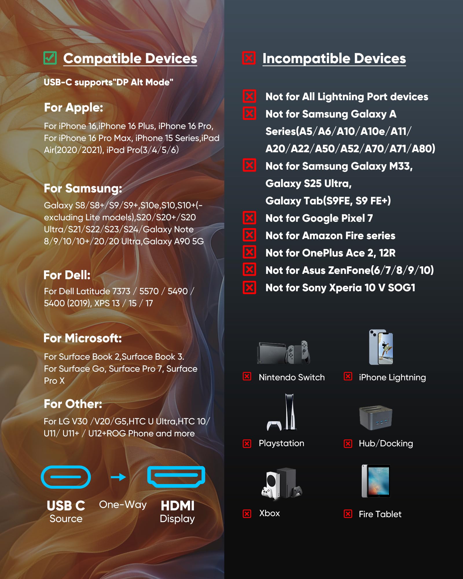 【Broad Compatibility (Req. DP Alt Mode)】This thunderbolt 3/4/5 to HDMI cable is compatible with iPhone 16, 15 Pro Max, 15 Pro, 15 Plus, MacBook Pro 2016-2024, MacBook Air 2018-2024, iMac (2017 and later), iPad Pro (2021 and later), iPad Air (2021 and later), Galaxy S24/S23/S22/S21/S20/S10/S9/S8 and more. Note: The USB-C to HDMI cable does NOT support charging and NOT for all lightning ports