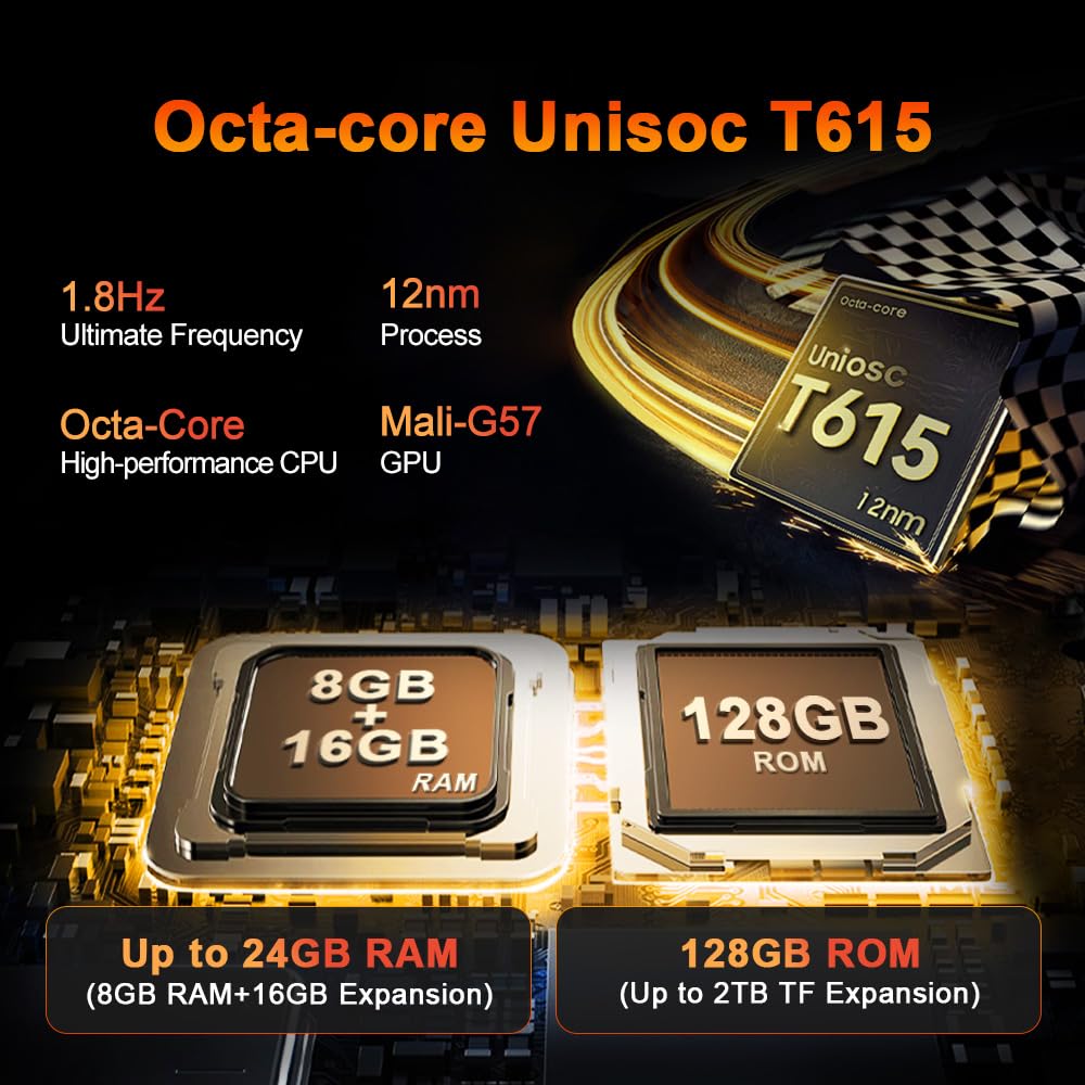 🚀【24GB RAM + 128GB ROM + 2TB + Unisoc T615】The Blackview ACTIVE 5 industrial tablet delivers exceptional performance with a combined 24GB RAM (8GB physical + 16GB virtual) and powerful 128GB UFS 2.1 storage, expandable up to 2TB via TF card for storing large technical files. Powered by the energy-efficient 12nm Unisoc T615 octa-core chipset, it ensures smooth operation under extreme conditions while UFS technology enables instant AI app launches and advanced multitasking, making it ideal for demanding environments like construction sites.