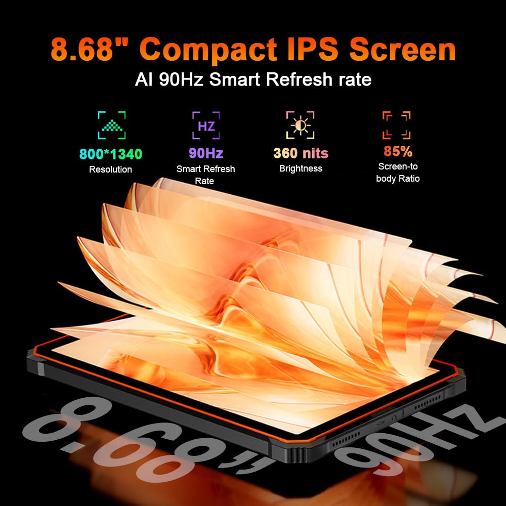 📱【Large Tablet with 8.68-Inch 90Hz IPS Display】The Blackview ACTIVE 5 robust tablet features an 8.68-inch IPS display with a resolution of 800x1340, protected by Panda MN228 toughened glass for scratch and impact resistance. Its 90Hz AI refresh rate optimizes both smoothness and energy efficiency, while five blue light modes ensure superior visual comfort. It supports Glove Mode 2.0 for operation while wearing gloves and Widevine L1 for HD streaming on platforms like YouTube and Hulu.