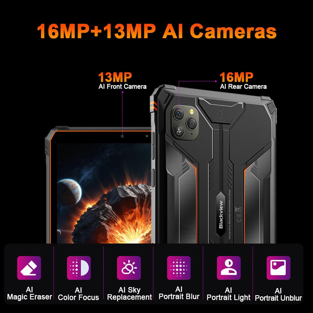 📷【16MP AI Main Camera + 13MP Front Camera】The Blackview ACTIVE 5 gaming tablet is equipped with an advanced AI dual-camera system, featuring a 16MP main camera and a 13MP front camera, both capable of recording smooth 1080P video even in extreme conditions. Additionally, this Android tablet is equipped with AI-powered features such as Magic Eraser for object removal, AI Portrait Light for professional-looking shots, and Sky Replacement for scene optimization, making it an ideal companion for high-demand outdoor photography.