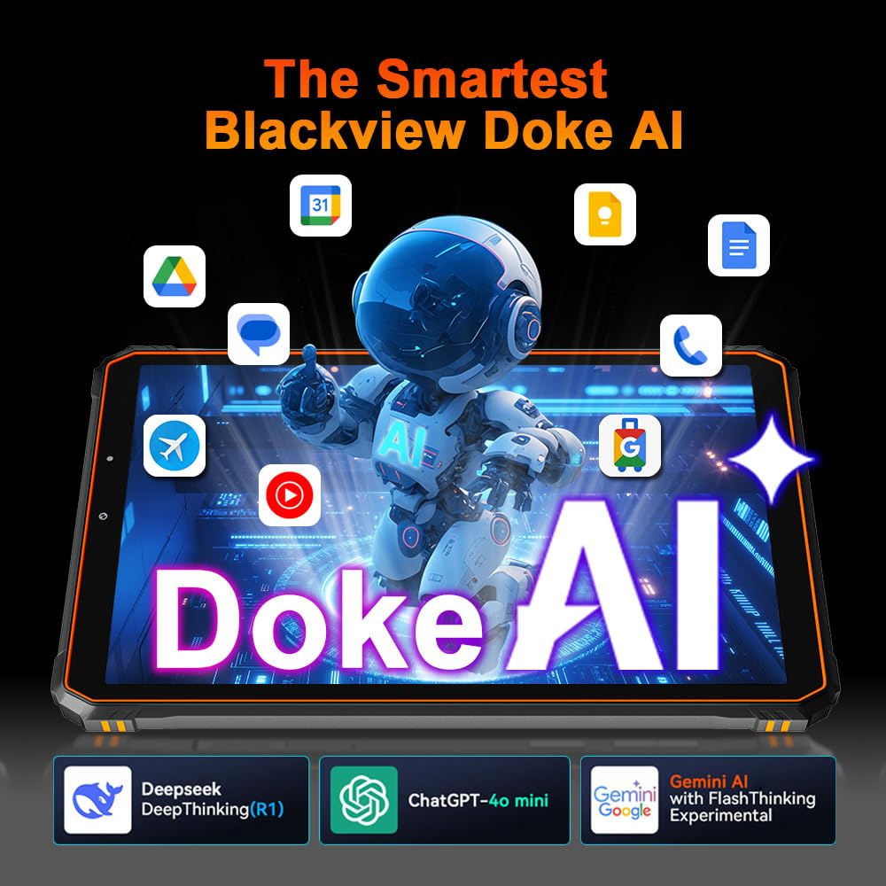 🤖【AI Tablet: Powerful AI Capabilities】The Blackview ACTIVE 5 Rugged Tablet revolutionizes human-machine interaction by integrating three global AI models—Deepseek, Gemini, and ChatGPT—enabling AI voice activation and full app control via vocal commands. It supports real-time multilingual conversations and offers full-screen assistance, alongside dedicated creative tools like ImageX for AI photo editing, VidGen for professional videos, and Soundle for immersive audio. Enhanced with Google Lens and advanced AI algorithms, this rugged tablet delivers unparalleled intelligence and adaptability in demanding environments.