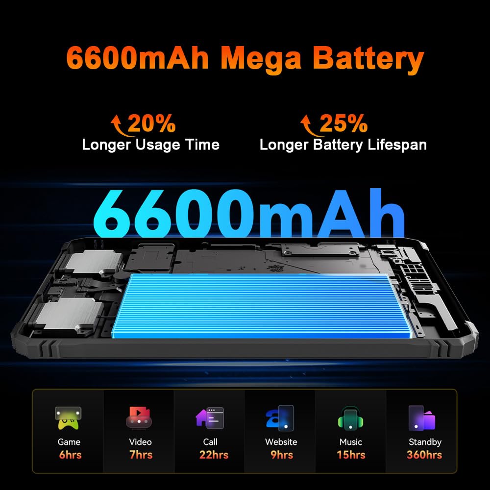 🔋【6600mAh Large Battery Tablet + OTG】Designed for endurance, the Blackview ACTIVE 5 outdoor tablet is equipped with a high-capacity 6600mAh battery featuring AI-optimized power management and fast charging, delivering up to 22 hours of voice calls, 15 hours of music playback, and 7 hours of video streaming. It offers an exceptional 360 hours of standby time and remains reliably cool under heavy usage thanks to its advanced cooling system, making it the perfect companion for extended outdoor adventure.