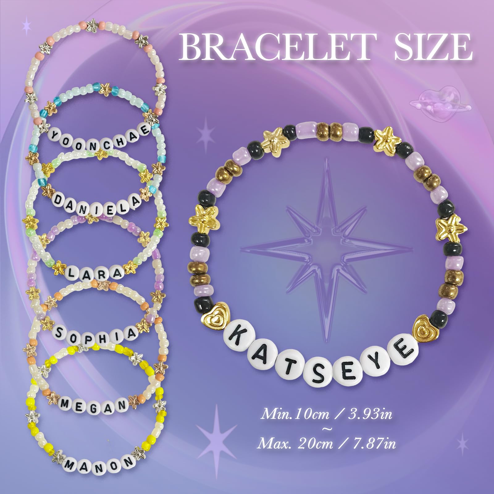 Description Product Description Celebrate your K-pop passion in style with this 7PCS Friendship Bracelet Set inspired by the KATSEYE group. Each bracelet is uniquely designed with colorful beads and name letter charms, reflecting the distinct charm of every group member. Whether you’re a fan of powerful vocals, captivating performances, or just love meaningful accessories, these bracelets make the perfect keepsake. Made with stretchable, comfortable elastic and soft rounded beads, these bracelets are easy to wear and suitable for most wrist sizes. Whether you’re heading to a concert, gifting your besties, or simply adding sparkle to your outfit, this bracelet set brings fan love into your daily fashion. Great for fans, friends, and music lovers alike—express your support with style, or share the set with others in your fandom circle. Specifications: Material: Acrylic beads + Elastic cord Bracelet Quantity: 7 pieces per set Styles Included: MEGAN, DANIELA, YOONCHAE, SOPHIA, MANON, LARA, KATSEYE Fits: Most teen and adult wrists (stretchable) Packaging: Comes in a protective, giftable pouch Directions for Use: Slip over your wrist gently—bracelets will stretch to fit. Avoid submerging in water to preserve color and elasticity. Store in a dry place when not in use. Note: Not official merchandise. Inspired by fan culture and made for decorative and expressive wear. If you receive a defective or broken bracelet, please contact us. We’re happy to help with a fast replacement or refund.