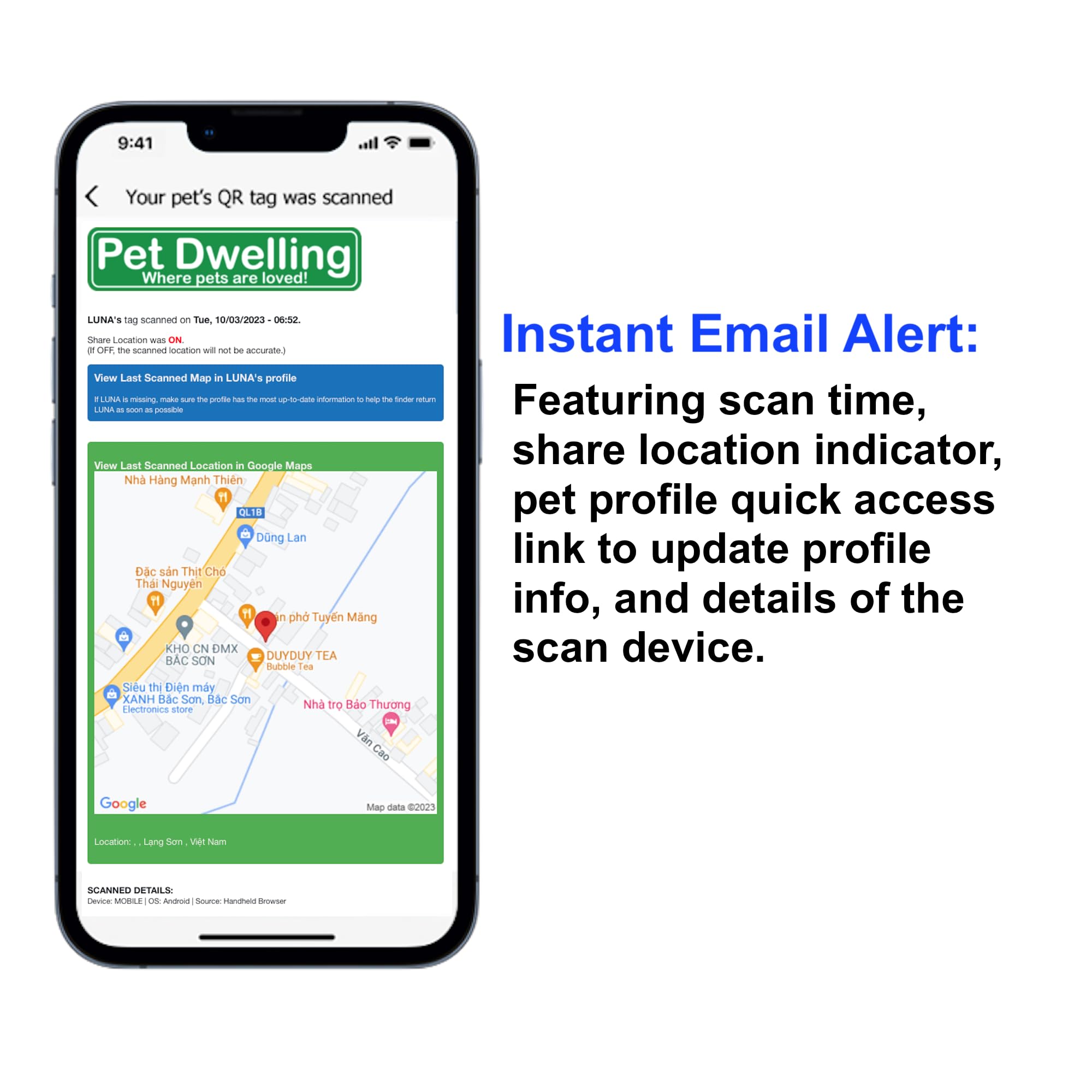 Instant Scan Alerts – Receive email notifications with the location and time of each scan. Track scan history, and finders can call you instantly with one tap.
