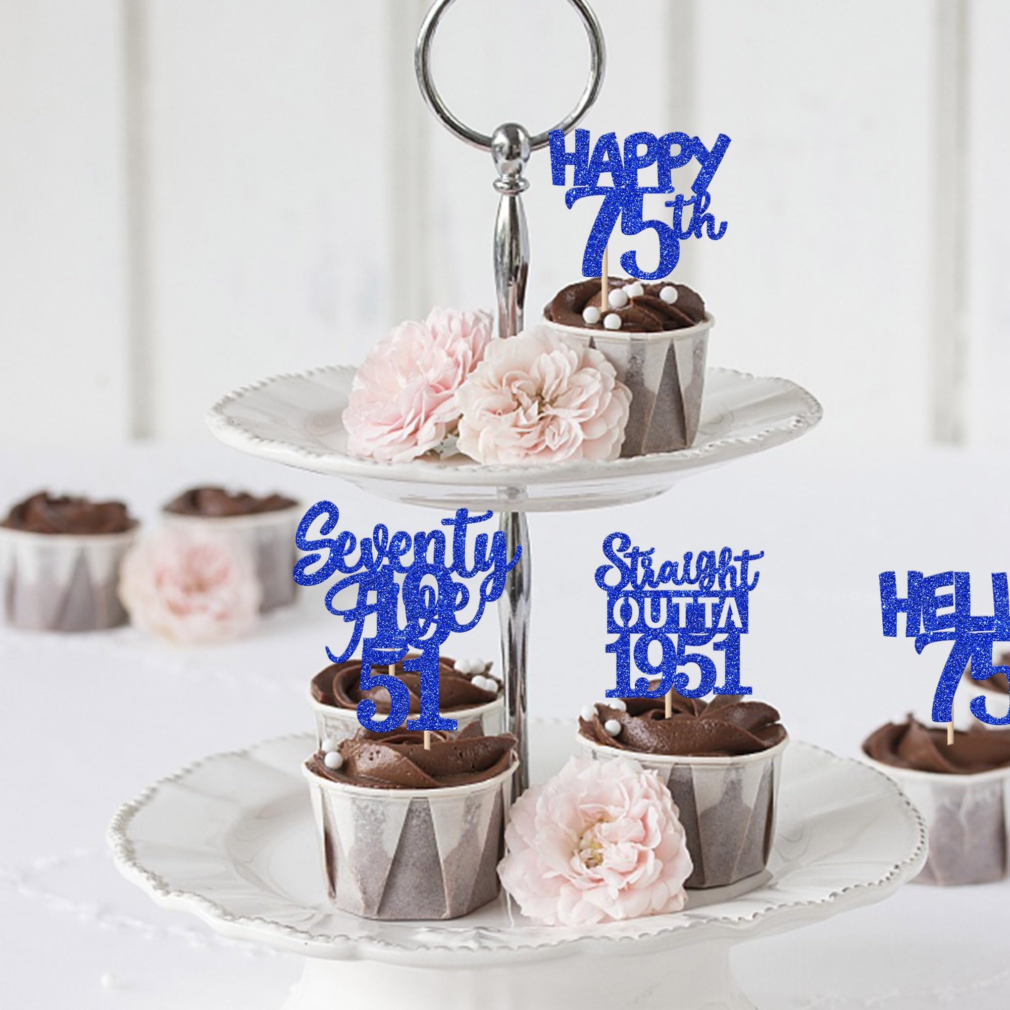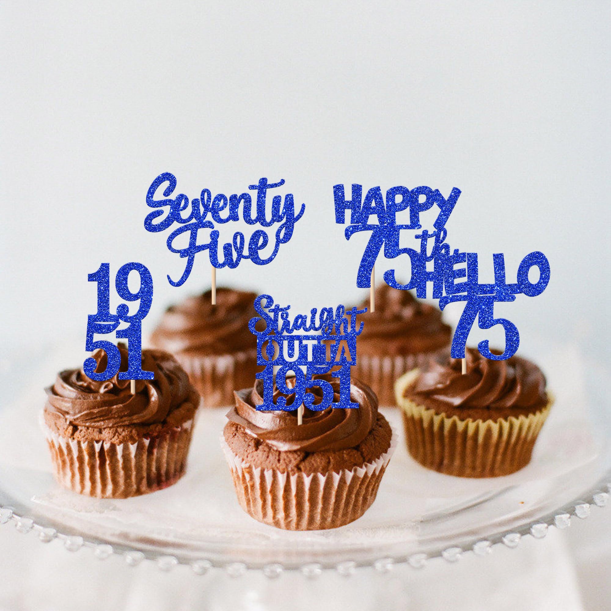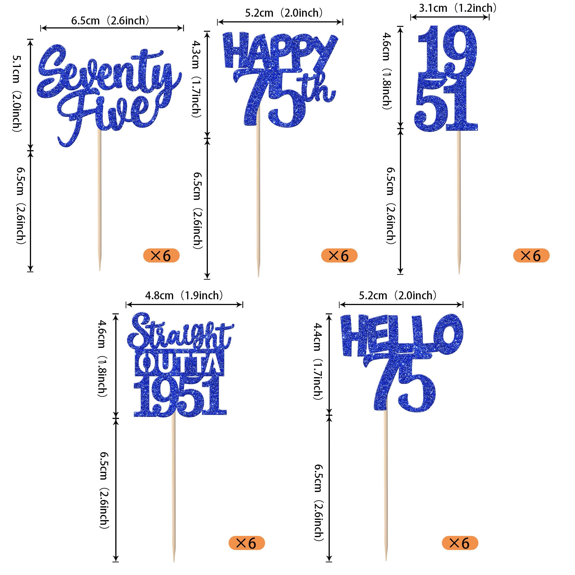 30 PCS 75th Birthday Cupcake Toppers Glitter Seventy Five Happy 75th Straight Outta 1951 Cupcake Picks for Cheers to 75 Fabulous 75th Birthday Anniversary Party Cake Decorations Supplier Blue Perfect for happy 75th bithday theme party, straight outta 1951 theme party, 75th wedding anniversary theme party,cheers to 75 years theme party cupcake decorations supplies. Pack of 30 pcs, 6 pcs of each design. The size is 1.9*4.6 inch / 1.3*3.9 inch / 2.1*4.6 inch / 2.9*3.9 inch / 2.2*4.5 inch ( with stick ) Made of high quality paper card stock,thick and sturdy. These straight outta 1951 cupcake toppers are one side glitter, another side is white, and they are intended for decoration only, please do not put them in oven or microwave. If the item you received has any defects, please contact us immediately. we will deal with it within 24 hours.