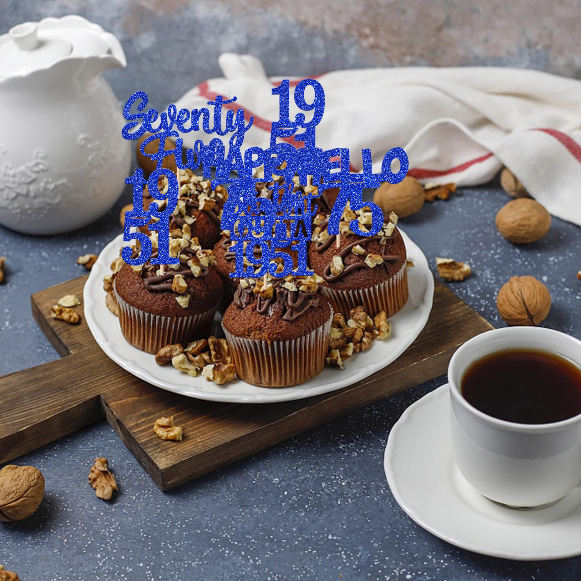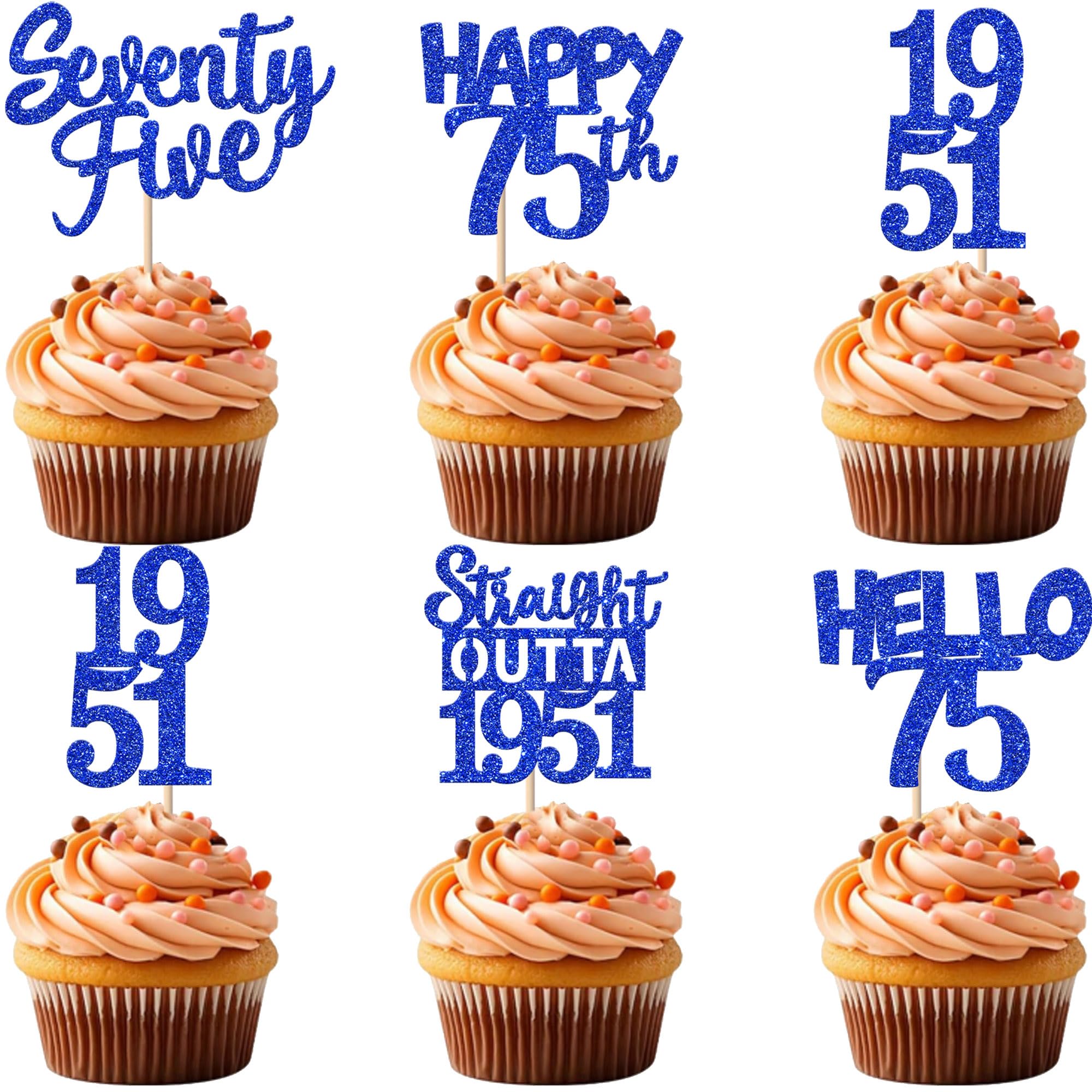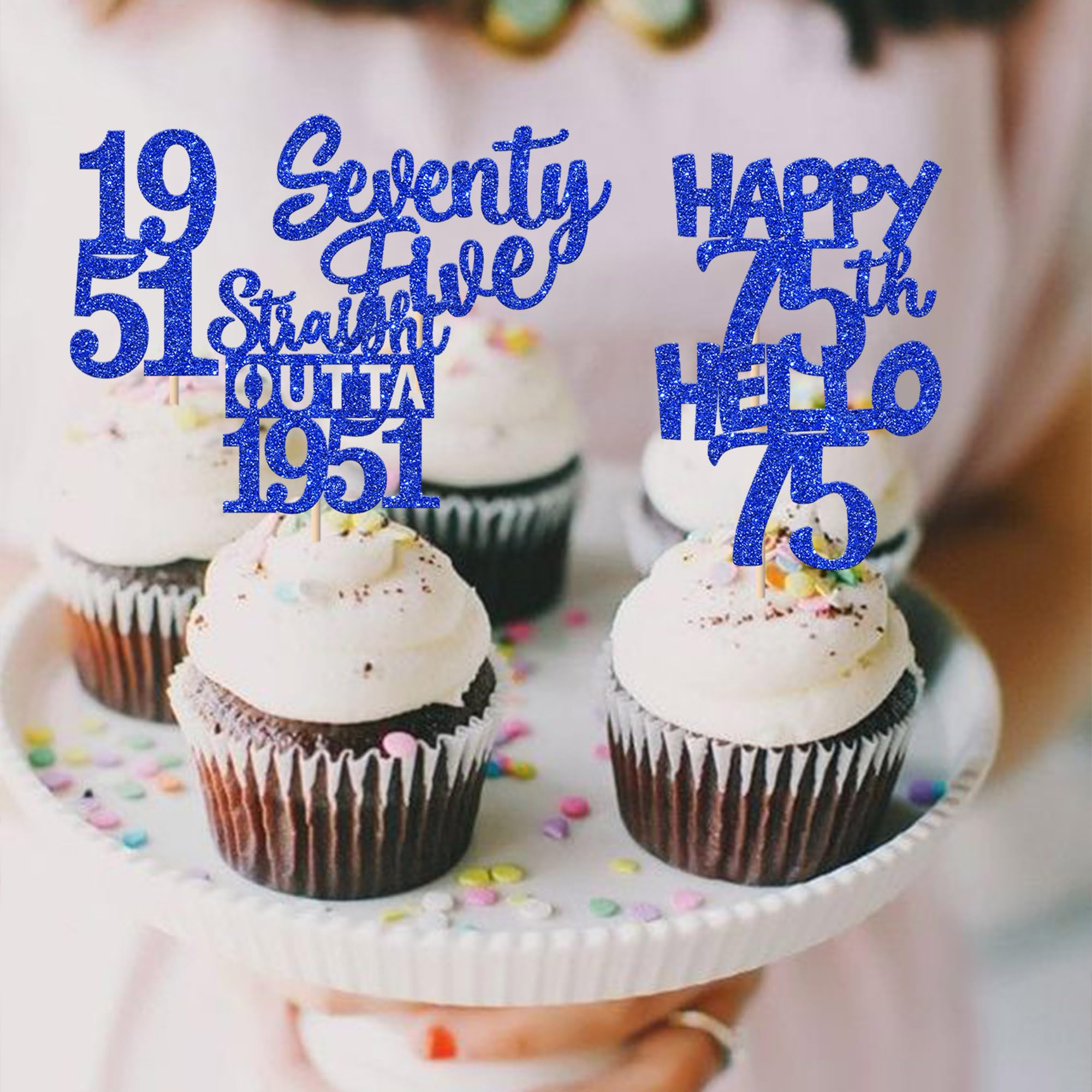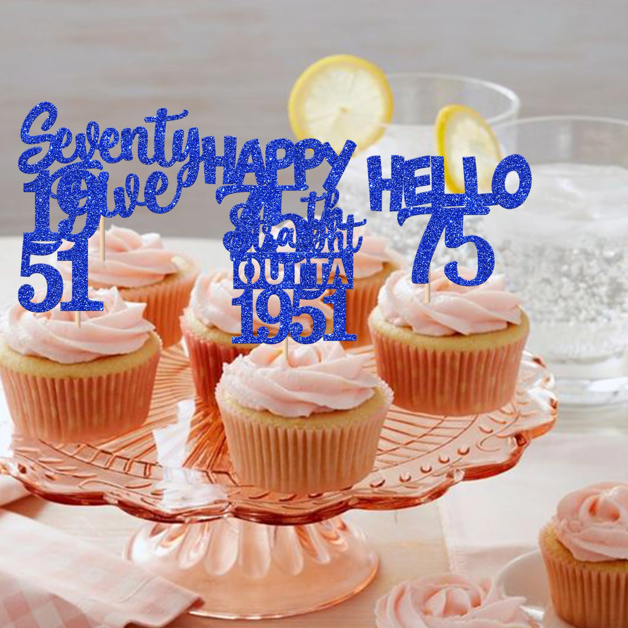 30 PCS 75th Birthday Cupcake Toppers Glitter Seventy Five Happy 75th Straight Outta 1951 Cupcake Picks for Cheers to 75 Fabulous 75th Birthday Anniversary Party Cake Decorations Supplier Blue Perfect for happy 75th bithday theme party, straight outta 1951 theme party, 75th wedding anniversary theme party,cheers to 75 years theme party cupcake decorations supplies. Pack of 30 pcs, 6 pcs of each design. The size is 1.9*4.6 inch / 1.3*3.9 inch / 2.1*4.6 inch / 2.9*3.9 inch / 2.2*4.5 inch ( with stick ) Made of high quality paper card stock,thick and sturdy. These straight outta 1951 cupcake toppers are one side glitter, another side is white, and they are intended for decoration only, please do not put them in oven or microwave. If the item you received has any defects, please contact us immediately. we will deal with it within 24 hours.