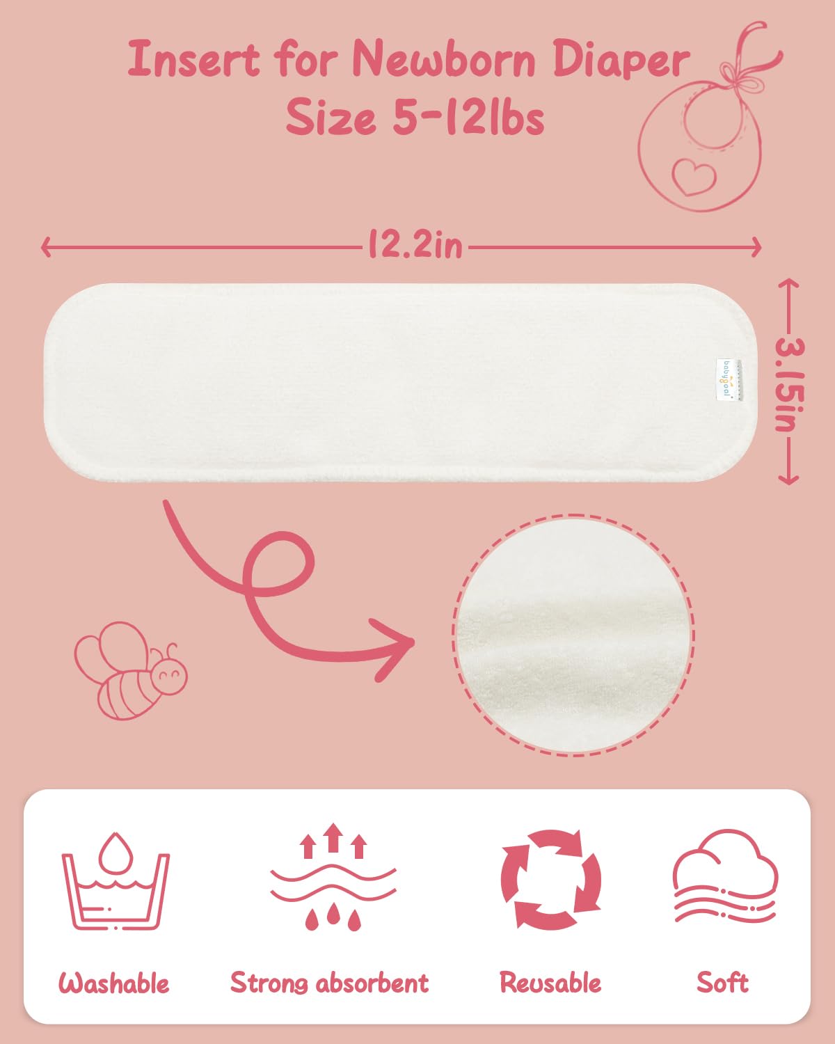 Dimension & Packing: 31cm in length(12.2'') *8cm in width (3.15''), fit for babies weigh 5-12lbs Preemie. The package includes 12pcs 4-layer rayon from bamboo inserts for babygoal newborn cloth diapers, small size.