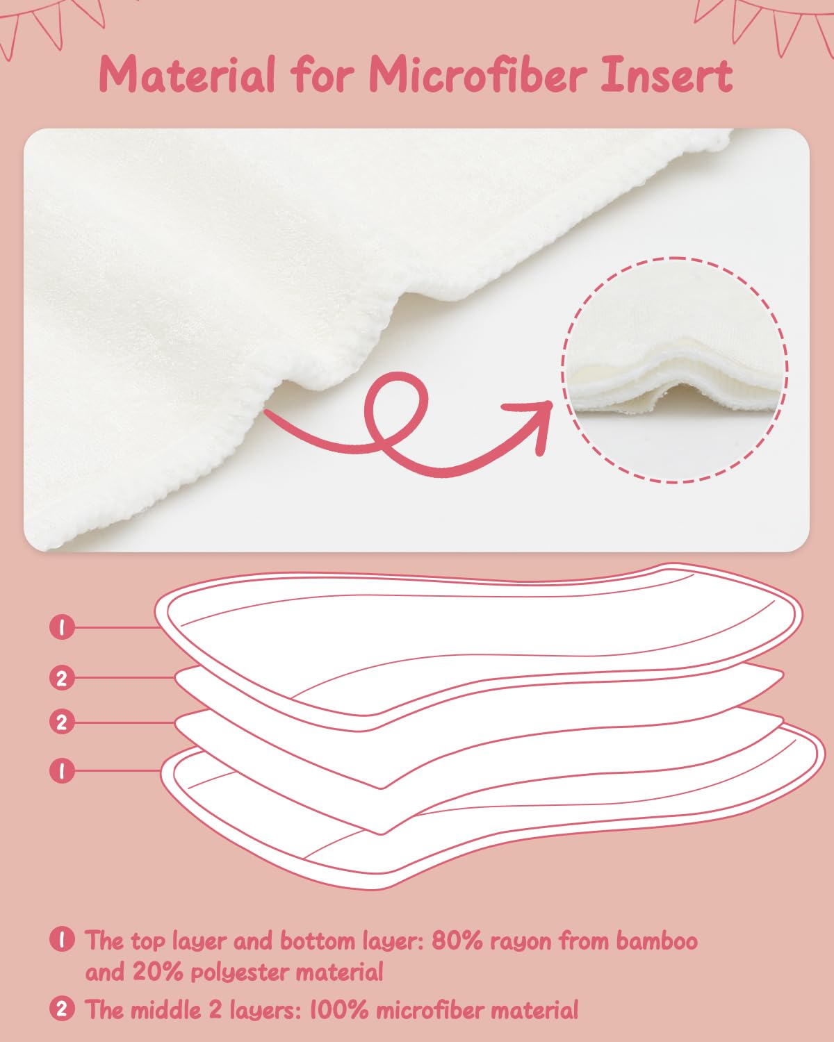 Super Absorbent and Soft: The inserts are made of 2 layers of rayon from bamboo fiber outer layer and 2 layer of microfiber inner layer, 71.3% rayon derived from bamboo and 28.7% polyester. The strong absorbent material with breathability and softness is gentle on your babies' bottom, keeping your baby dry and comfortable. They will become more absorbent when they are washed.
