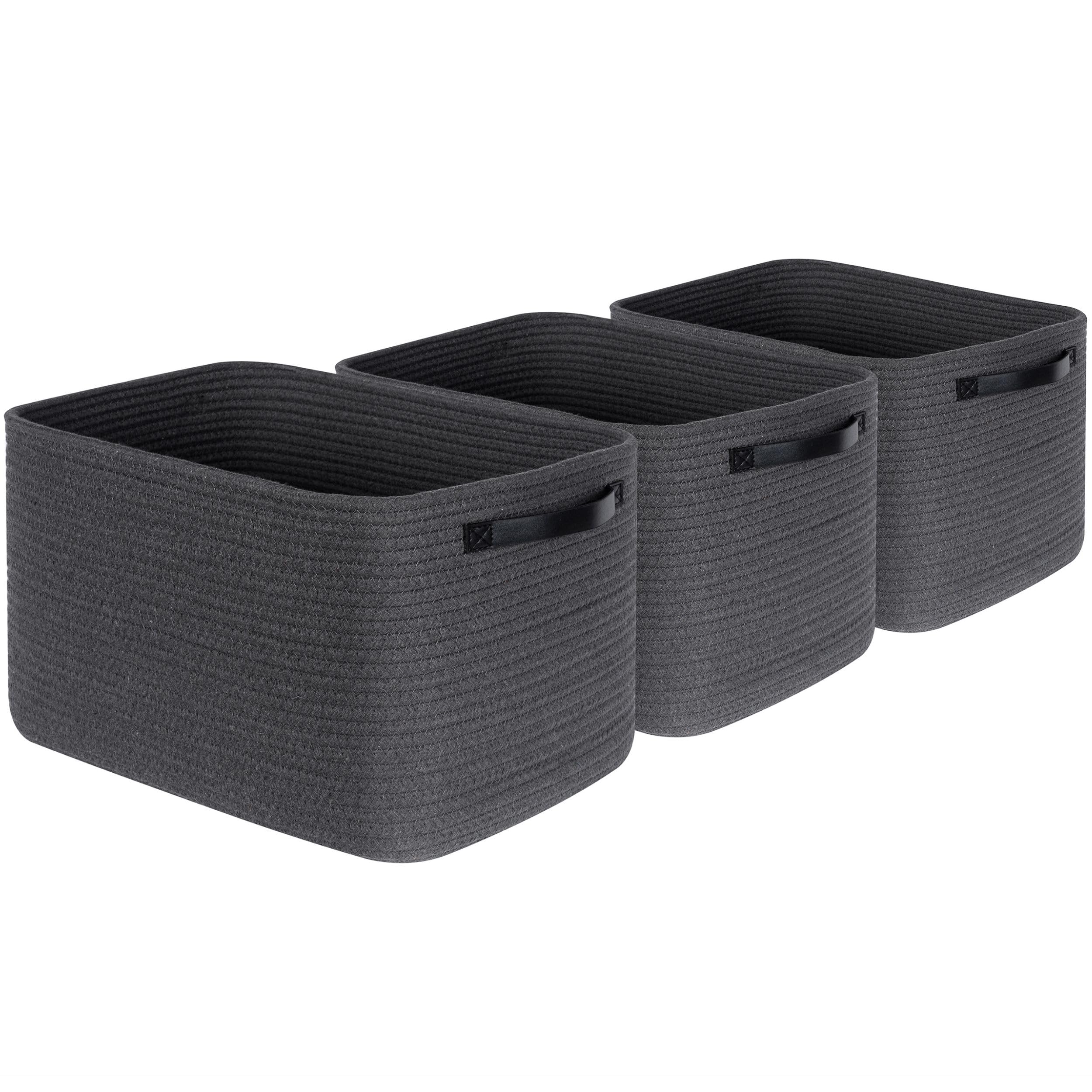 Well-Sized Bins with Elegant Slit Handles - Set of Three (3) Basket Bins: 15" (L) x 10" (W) x 10" (H). Our baskets are handmade with flexible material, which may result in slight size variations. Measurements should be taken from the center of each side to the center of the opposite side after the bins are fully unfolded & expanded. Taking measurements along just one side or when it is folded may result in smaller measurements due to the rounded corners and folding.