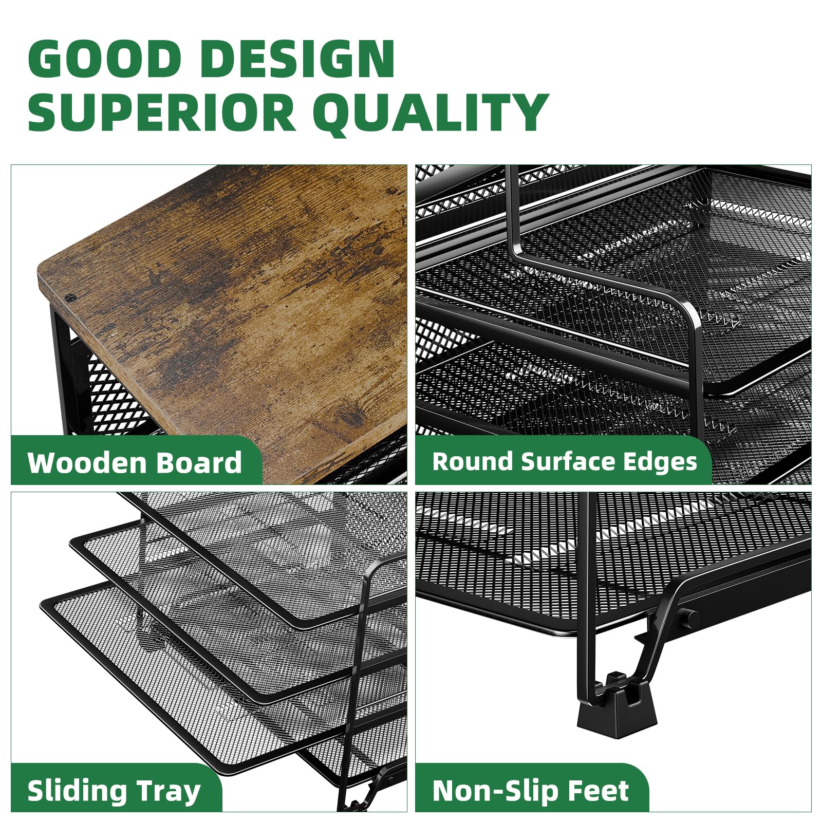 Premium Materials: The top shelf of the office desk organizer is made of sturdy wood, while the trays are crafted from lightweight, durable metal mesh, ensuring reliable performance. When in use, the smooth grooves allow the trays to be easily pulled out and pushed back in.