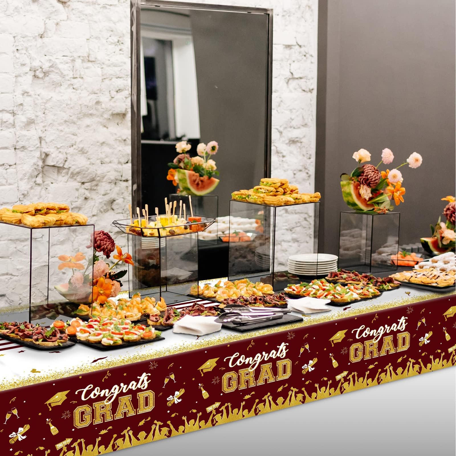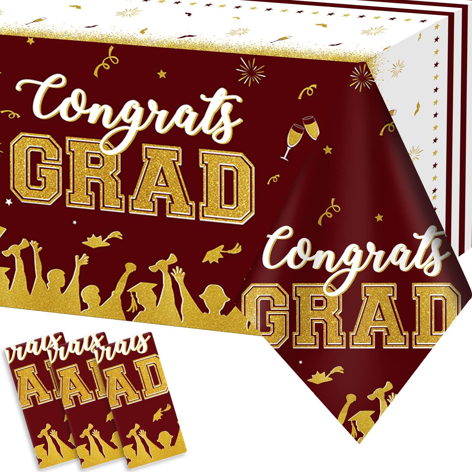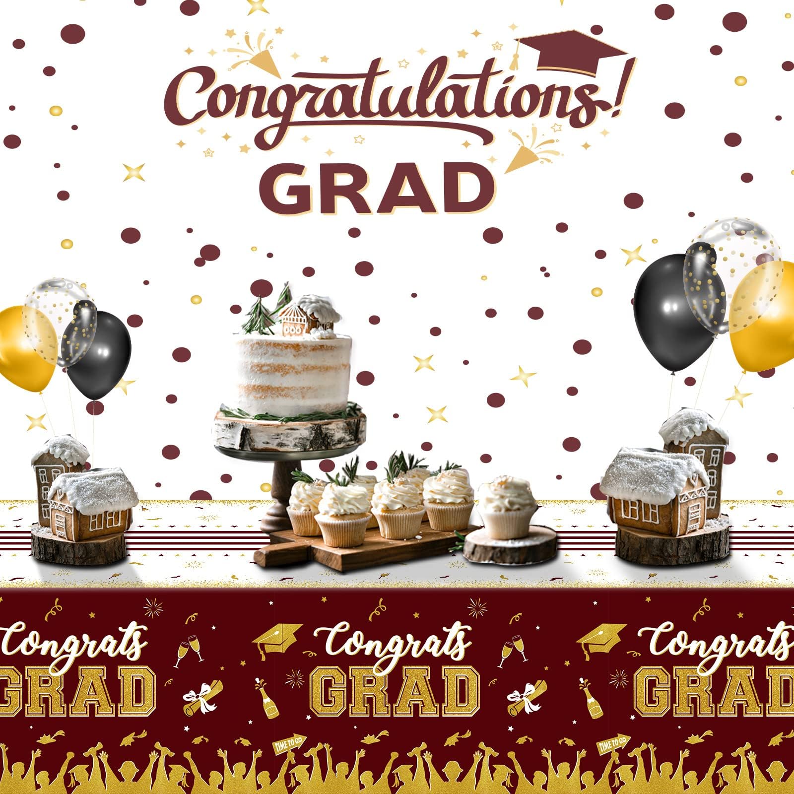 【What You Get】Includes 3 pieces of Maroon & Gold Congrats Grad Graduation Party tablecloth, printed with “Congrats Grad” words, balloons, graduation cap etc. These graduation party table decorations are so chic and funny that make your theme party a big hit.