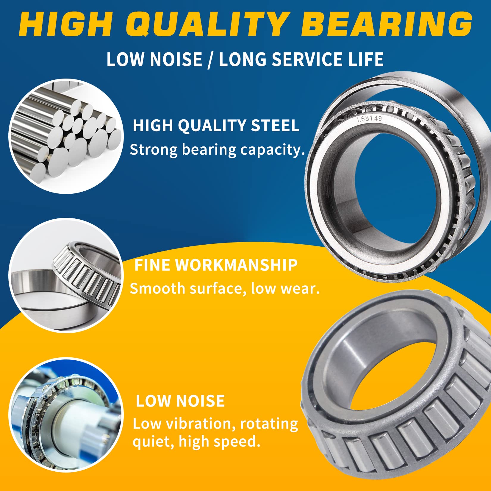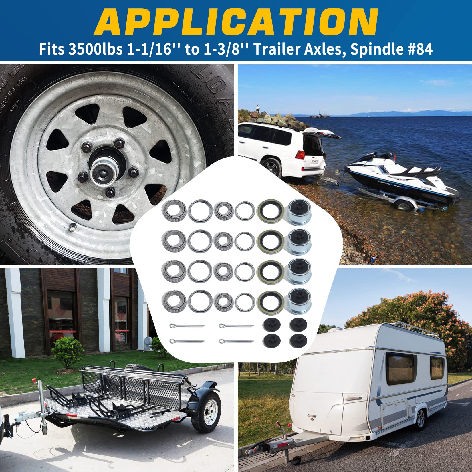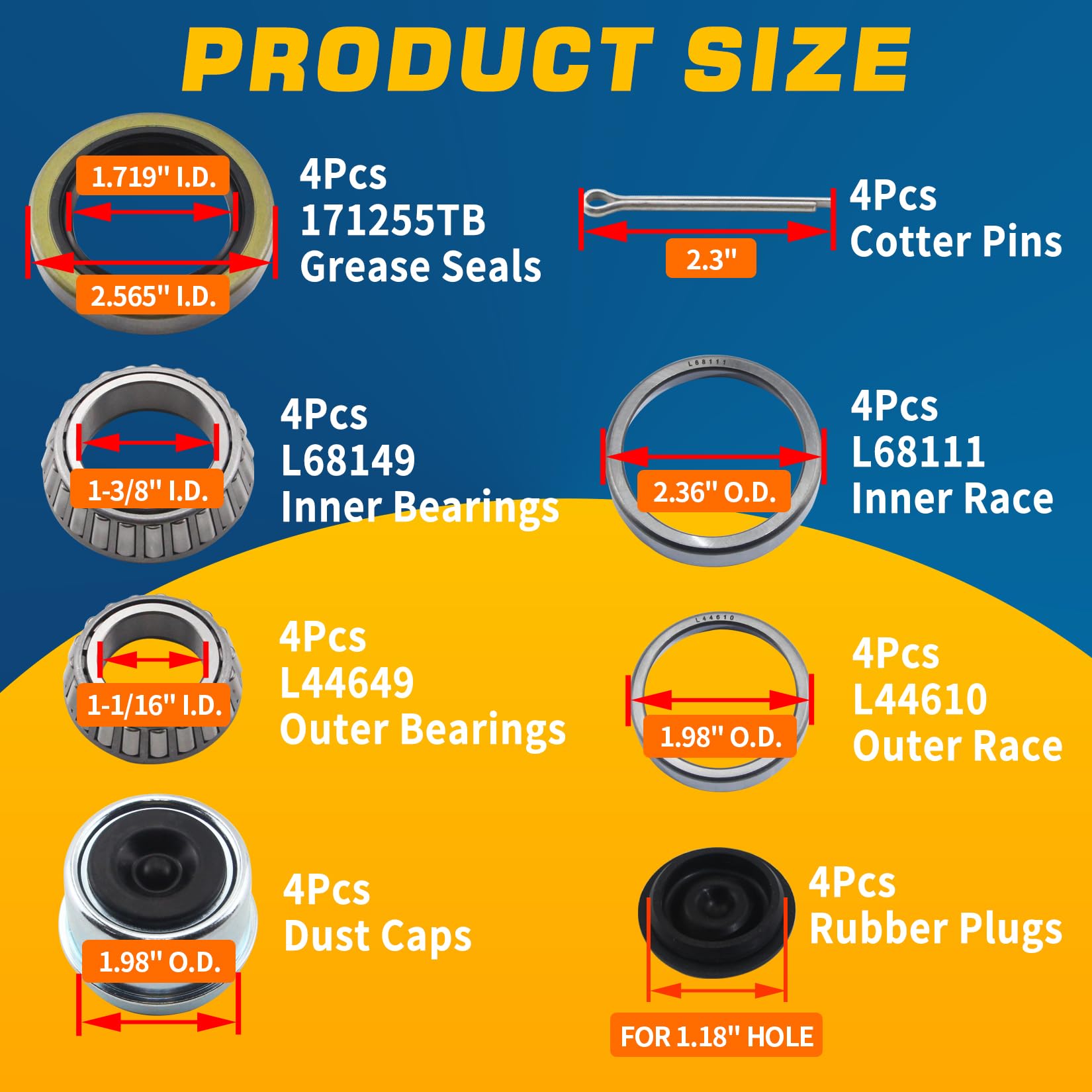 【GREAT VALUE PACK】These 4Sets trailer hub bearings kits include 32Pcs parts: 4Pcs L68149 Bearings + 4Pcs L68111 Races, 4Pcs L44649 Bearings + 4Pcs L44610 Races, 4Pcs 171255TB Grease Seals (1.719''I.D, 2.565''O.D), 4Pcs Cotter Pins, 4Pcs Dust Caps (1.98''O.D.), 4Pcs Rubber Plugs. Value-for-money sets! Meet the need for multiple repairs and spare parts.