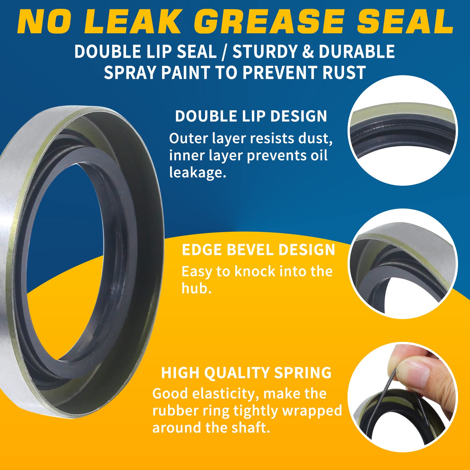【STURDY AND DURABLE】High quality chrome steel bearings are sturdy & durable, low wear , low vibration and low working noise. Double lip grease seals, no leak. All trailer hub parts are made of high quality materials and have a long service life.