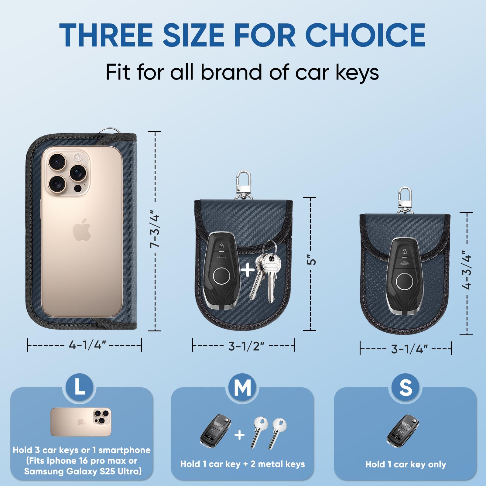 Premium Quality: TICONN Faraday bag features premium carbon fiber-textured material with dual-layer shielding that blocks WiFi, Bluetooth, GPS, RFID, NFC, and car key fob signals while providing water resistance; It is packaged in a gift box, making it a stylish and luxurious gift