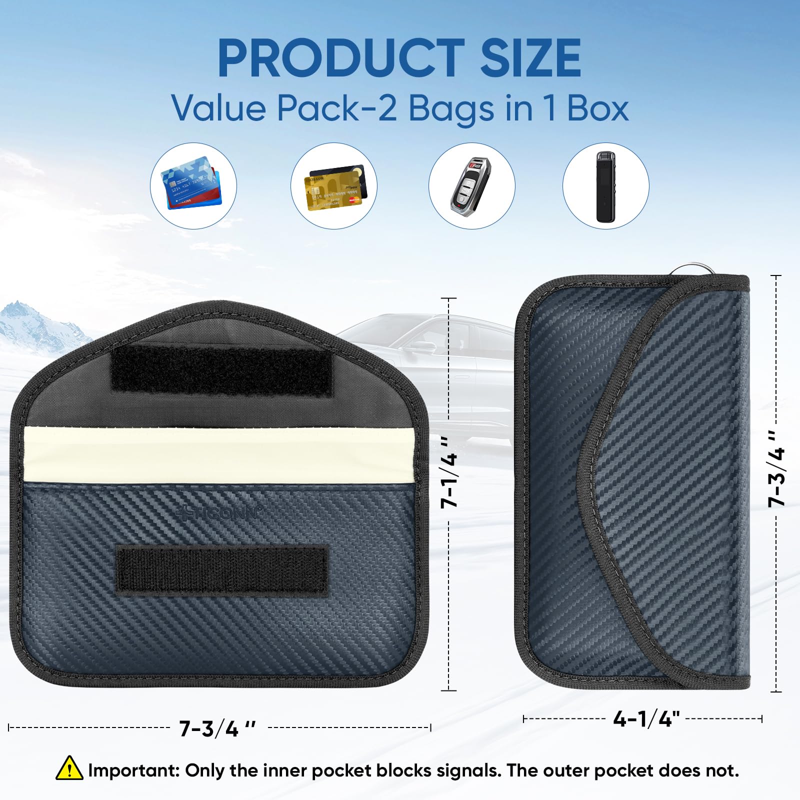 Convenience: The smaller/front pocket is anti-radiation, best for storing ID card, bank cards, etc; The larger/back pocket is for signal blocking, best for storing car key fobs