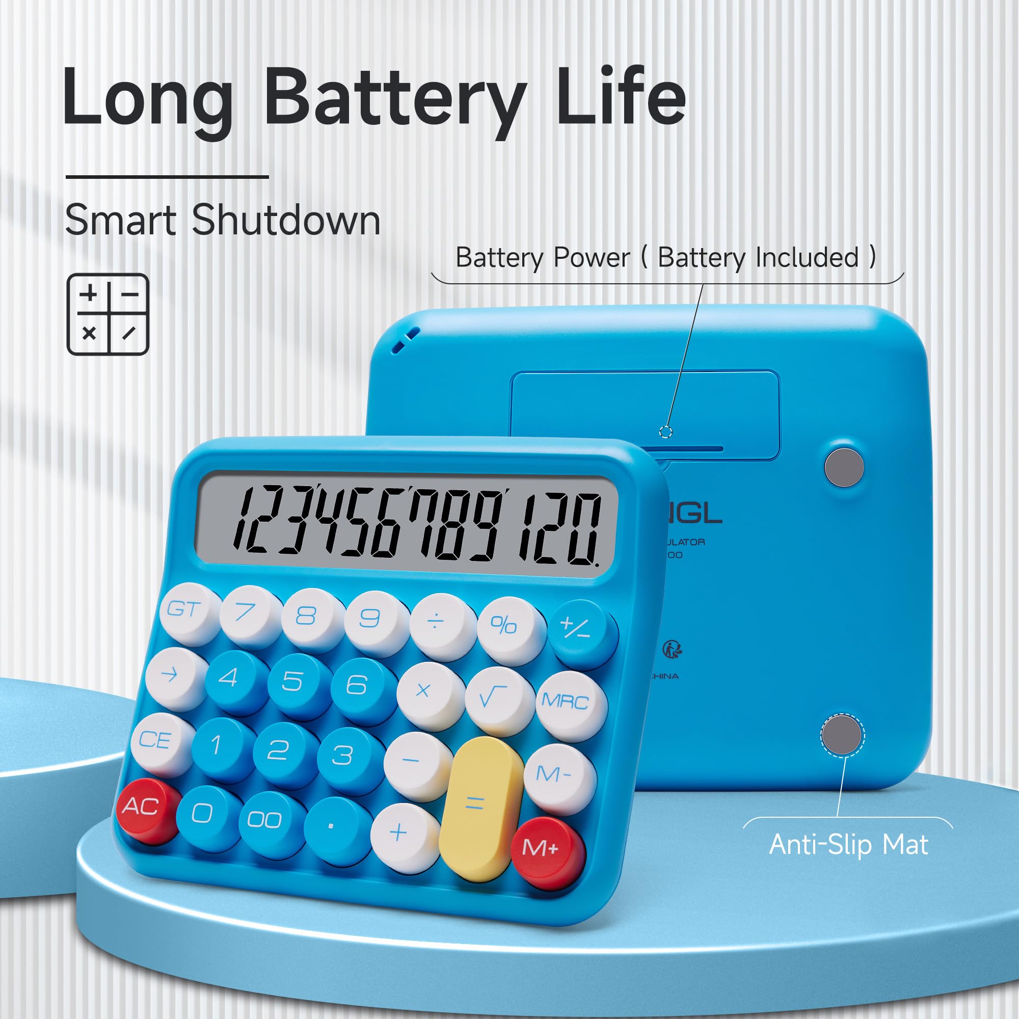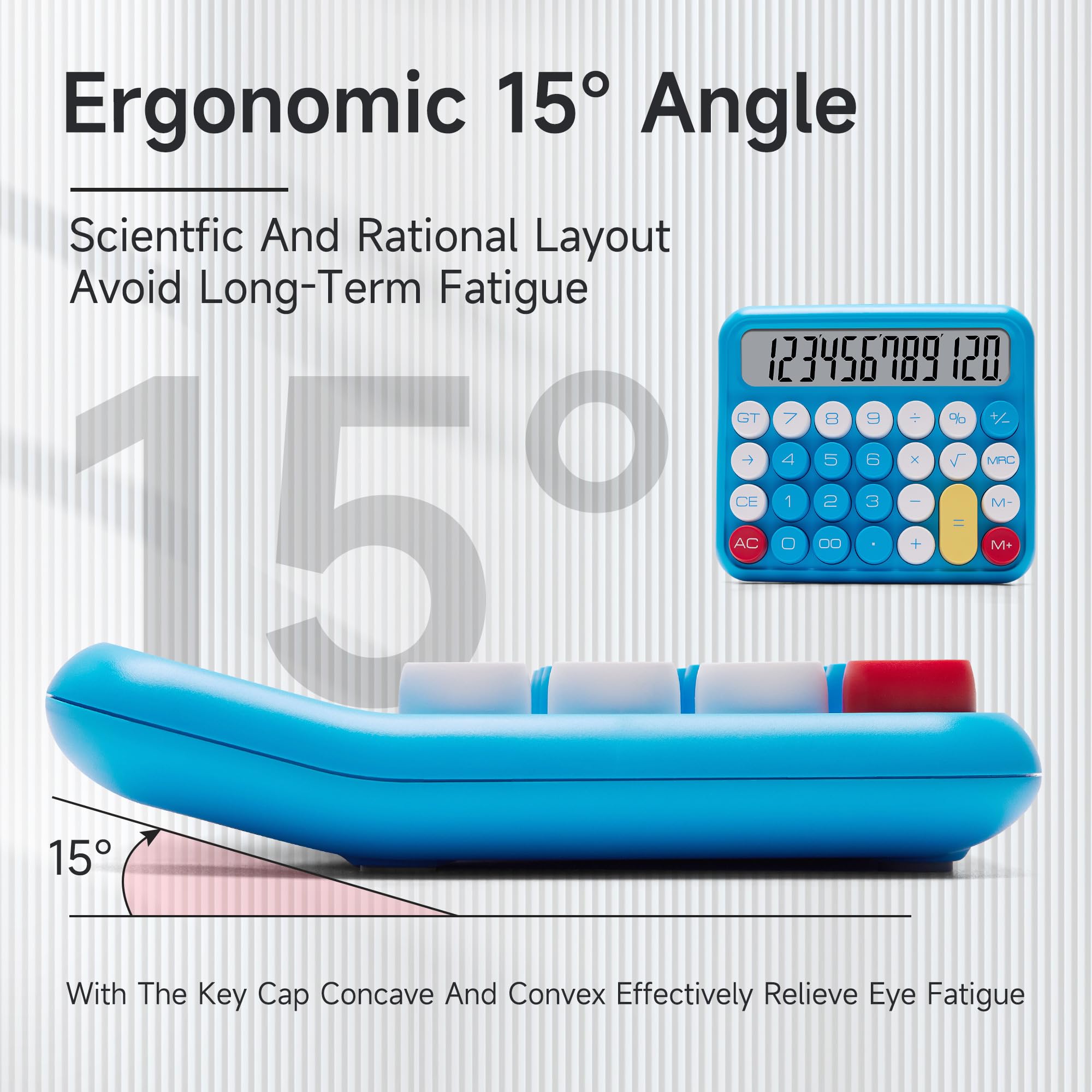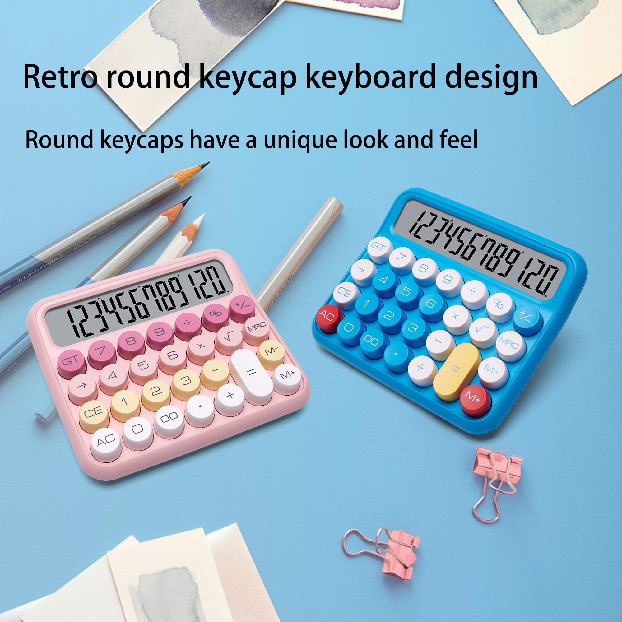 IMITATION MECHANICAL KEYBOARD: Imitating the knocking feel of a mechanical keyboard (the keyboard cannot be disassembled without special tools), the key operation is fast and accurate, bringing a pleasant experience.. The touch of your fingers and the unique clicking sound are addictive.Large button, candy color.Large LCD screen,12-digit display, vertical back,15-degree angle for easy-to-read calculator