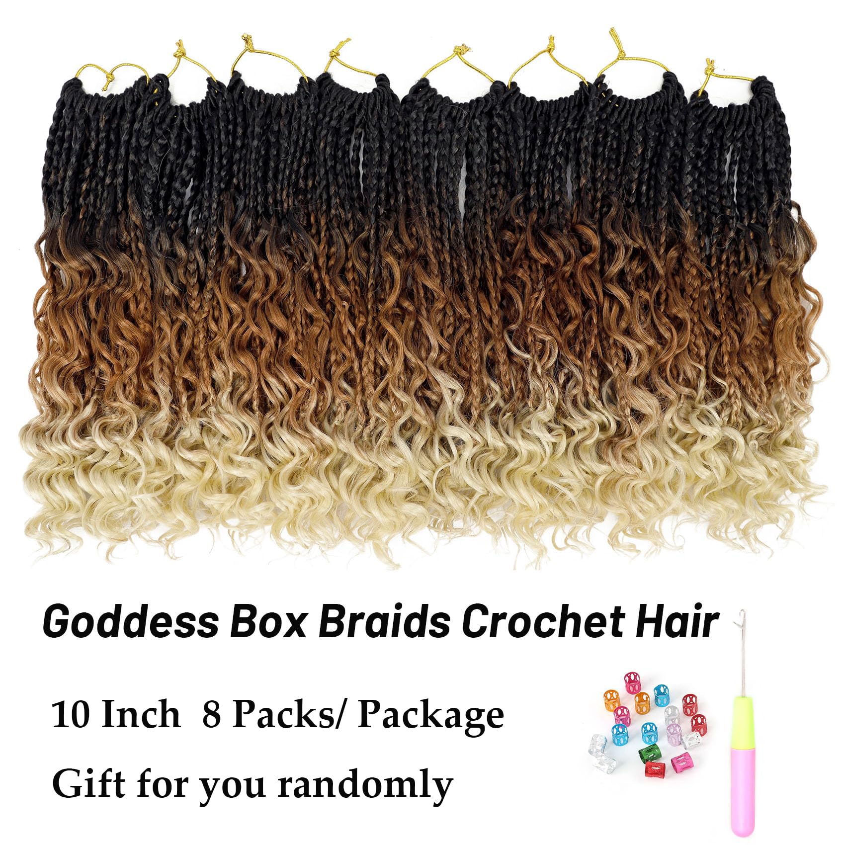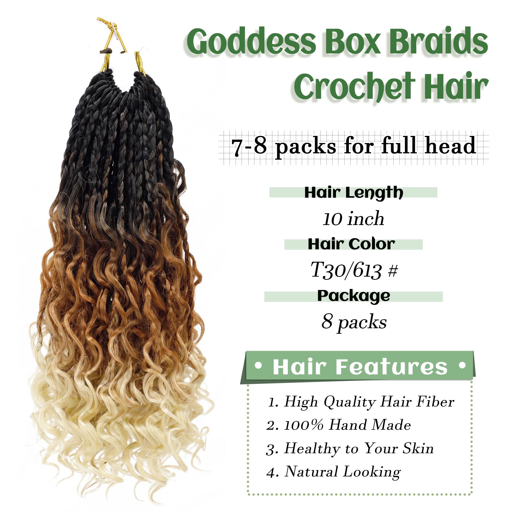 Hair Length and Package: goddess box braids crochet hair is 10 inch, 12 inch and 14 inch, 16 strands one pack, 8-9 packs are enough to make a full head. Hair Color:1B, #2 , #27 , #30 , 1B /27 color, 1B/30, T30/27,T30/613,Tgray color and 1B/Burgundy color. More colors are available.