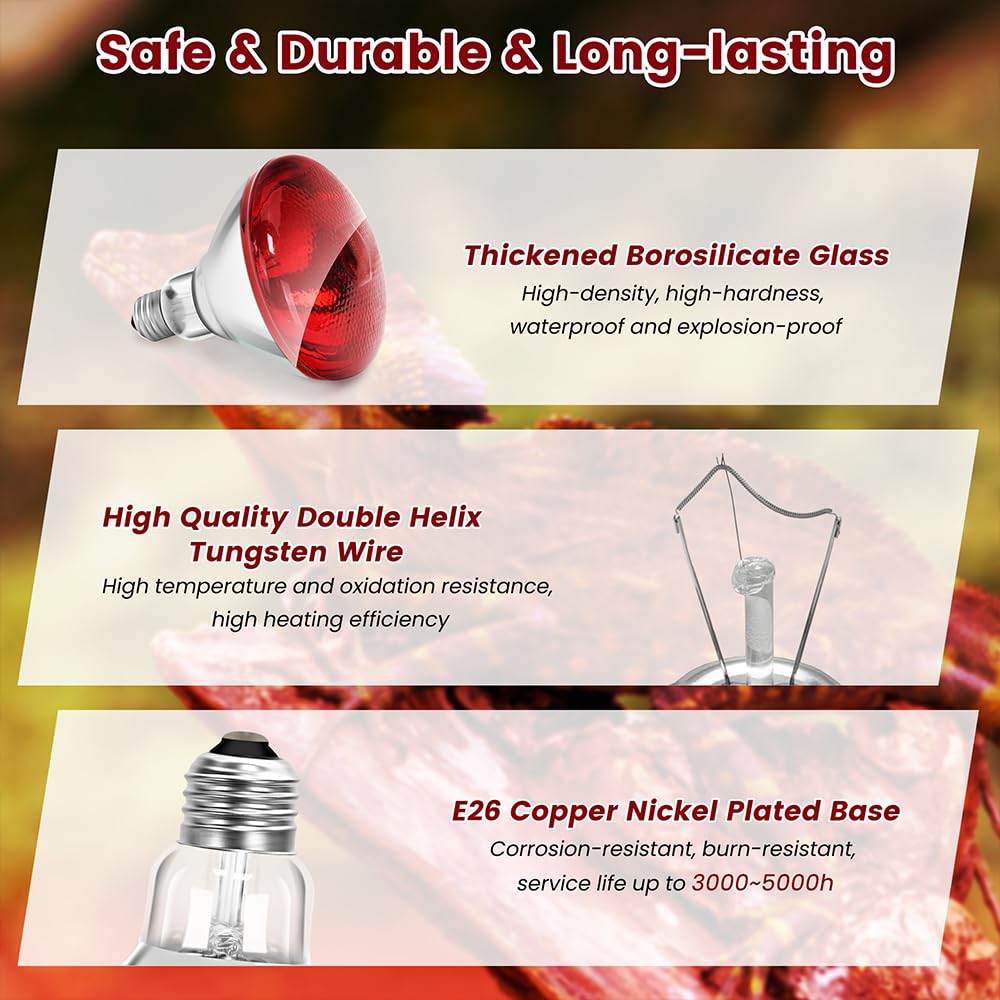 【Safe &Durable &Long-lasting】: DaToo chicken heat lamp is made of high-density, high-hardness thickened borosilicate glass, all of which have passed high-temperature and cold-water tests to ensure that it is not dangerous to use it for a long time in a high-temperature and humid environment. High quality double spiral tungsten filament, high heating efficiency. E26 copper nickel-plated lamp head, high conductivity, corrosion and burn resistance, service life up to 5000 hours.